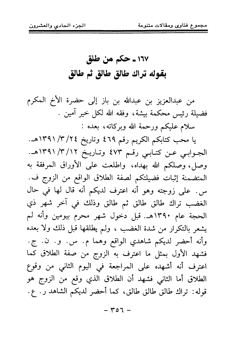 يا محب كتابكم الكريم رقم 469 وتاريخ 24\3\1391هـ. الجوابي عن كتابي رقم 473 وتاريخ 12\3\1391هـ. وصل، وصلكم الله بهداه، واطلعت على الأوراق المرفقة به المتضمنة إثبات فضيلتكم لصفة الطلاق الواقع من الزوج ف. س. على زوجته، وهو أنه اعترف لديكم أنه قال لها في حال الغضب: تراك طالق طالق ثم طالق، وذلك في آخر شهر ذي الحجة عام 1390هـ. قبل دخول شهر محرم بيومين، وأنه لم يشعر بالتكرار من شدة الغضب، ولم يطلقها قبل ذلك ولا بعده، وأنه أحضر لديكم شاهدي الواقع وهما م. س. و. ن. ج. فشهد الأول بمثل ما اعترف به الزوج من صفة الطلاق كما اعترف أنه أشهده على المراجعة في اليوم الثاني من وقوع الطلاق، أما الثاني فشهد أن الطلاق الذي وقع من الزوج هو قوله: تراك طالق طالق طالق، كما أحضر لديكم الشاهد ر. ع.
