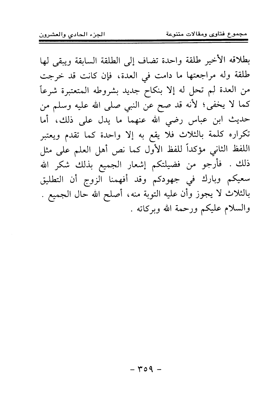 بطلاقه الأخير طلقة واحدة تضاف إلى الطلقة السابقة، ويبقى لها طلقة، وله مراجعتها ما دامت في العدة، فإن كانت قد خرجت من العدة لم تحل له إلا بنكاح جديد بشروطه المعتبرة شرعا كما لا يخفى؛ لأنه قد صح عن النبي - صلى الله عليه وسلم - من حديث ابن عباس - رضي الله عنهما - ما يدل على ذلك، أما تكراره كلمة بالثلاث فلا يقع به إلا واحدة كما تقدم، ويعتبر اللفظ الثاني مؤكدا للفظ الأول كما نص أهل العلم على مثل ذلك. فأرجو من فضيلتكم إشعار الجميع بذلك شكر الله سعيكم، وبارك في جهودكم، وقد أفهمنا الزوج إلى التطليق بالثلاث لا يجوز، وأن عليه التوبة منه، أصلح الله حال الجميع، والسلام عليكم ورحمة الله وبركاته.