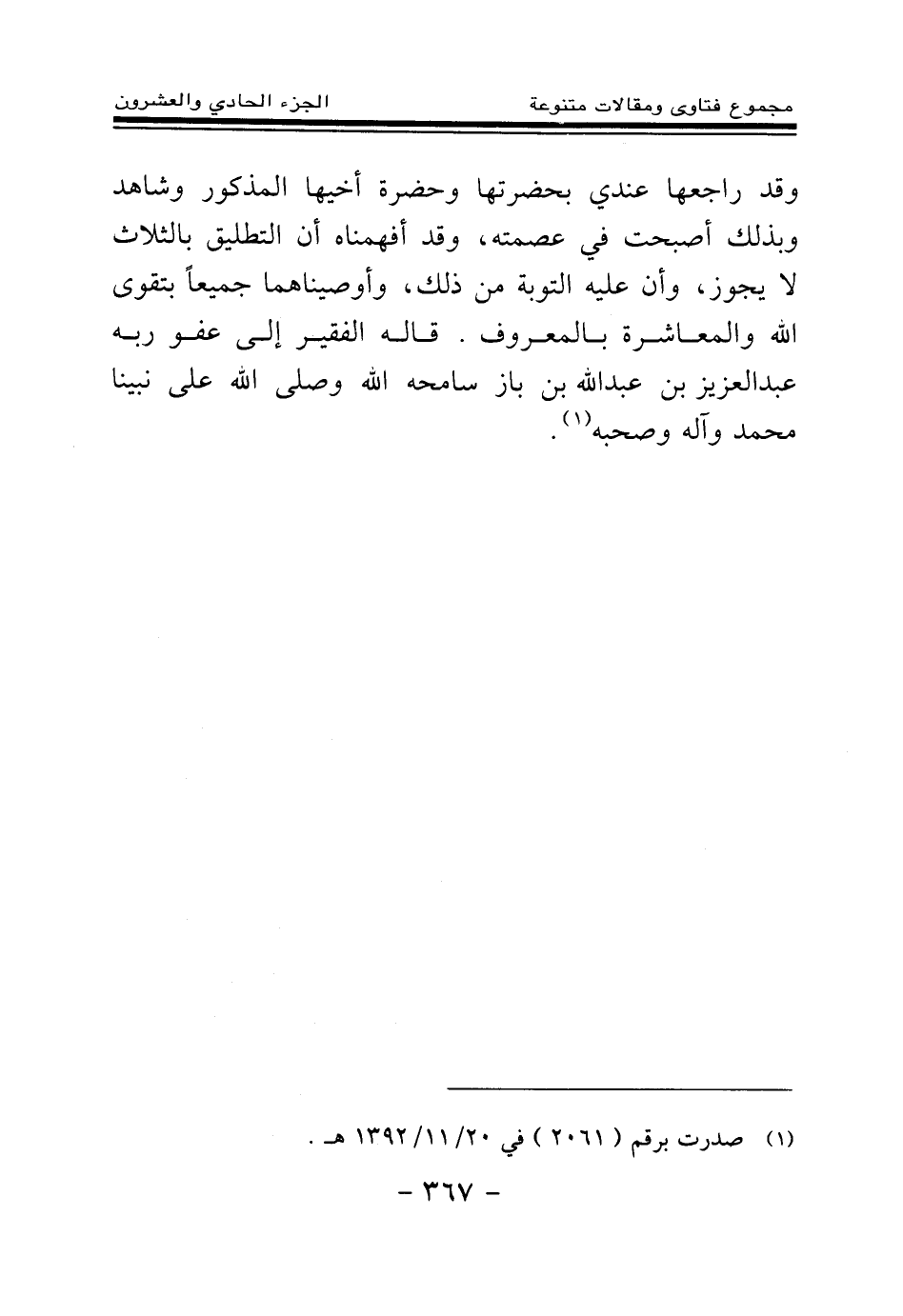 وقد راجعها عندي بحضرتها وحضرة أخيها المذكور وشاهد، وبذلك أصبحت في عصمته، وقد أفهمناه أن التطليق بالثلاث لا يجوز، وأن عليه التوبة من ذلك، وأوصيناهما جميعا بتقوى الله والمعاشرة بالمعروف. قاله الفقير إلى عفو ربه عبد العزيز بن عبد الله بن باز سامحه الله، وصلى الله على نبينا محمد وآله وصحبه (¬1) .