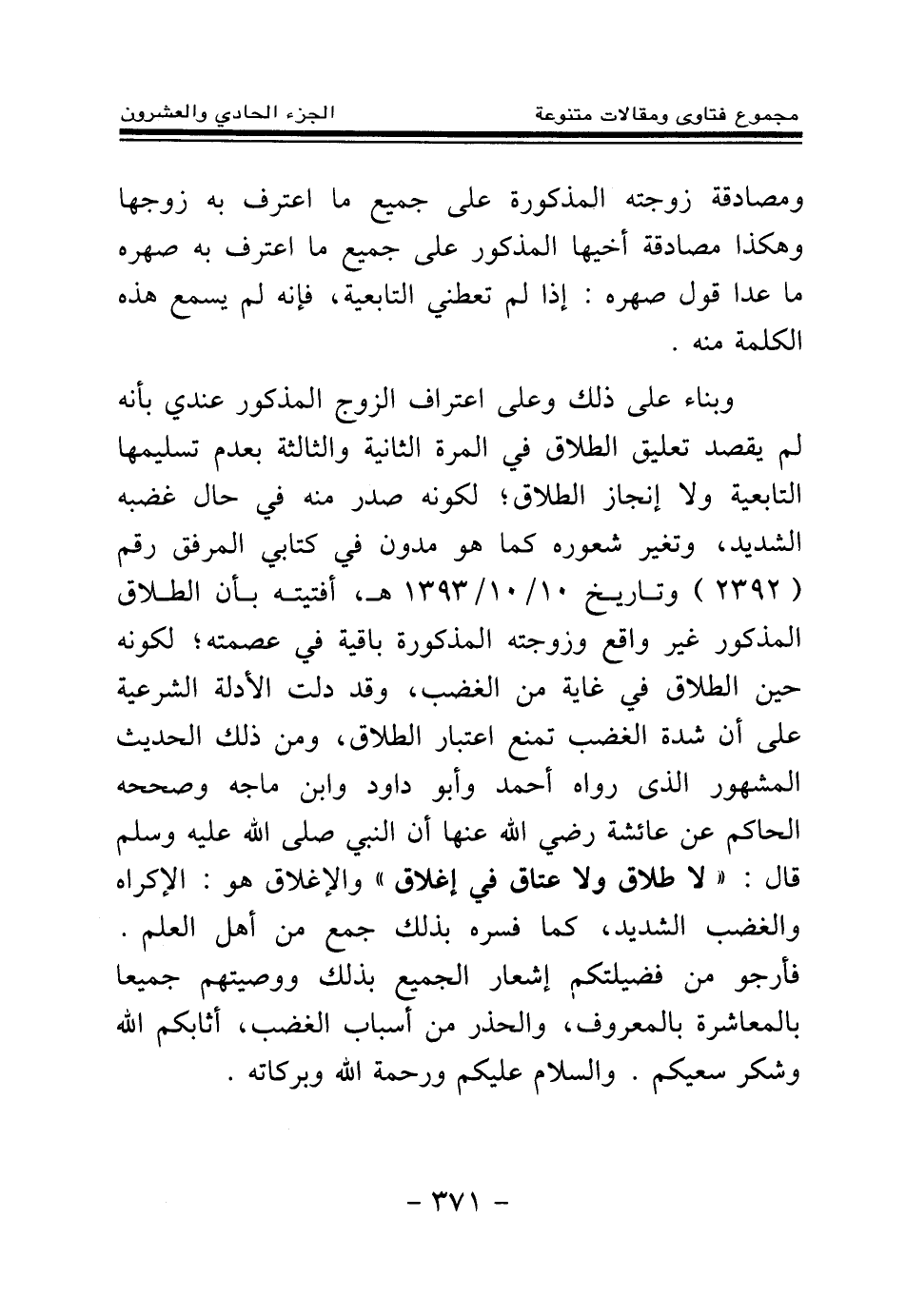 وبناء على ذلك وعلى اعتراف الزوج المذكور عندي بأنه لم يقصد تعليق الطلاق في المرة الثانية والثالثة بعدم تسليمها، التابعية ولا إنجاز الطلاق؛ لكونه صدر منه في حال غضبه الشديد، وتغير شعوره كما هو مدون في كتابي المرفق رقم (2392) وتاريخ 10\10\1393هـ، أفتيته بأن الطلاق المذكور غير واقع وزوجته المذكورة باقية في عصمته؛ لكونه حين الطلاق في غاية من الغضب، وقد دلت الأدلة الشرعية على أن شدة الغضب تمنع اعتبار الطلاق، ومن ذلك الحديث المشهور الذي رواه أحمد وأبو داود وابن ماجه وصححه الحاكم عن عائشة - رضي الله عنها - أن النبي - صلى الله عليه وسلم - قال: «لا طلاق ولا عتاق في إغلاق (¬1) » والإغلاق هو الإكراه والغضب الشديد، كما فسره بذلك جمع من أهل العلم. فأرجو من فضيلتكم إشعار الجميع بذلك، ووصيتهم جميعا بالمعاشرة بالمعروف، والحذر من أسباب الغضب، أثابكم الله، وشكر سعيكم. والسلام عليكم ورحمة الله وبركاته.