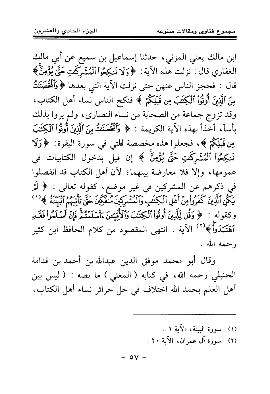 بن مالك - يعني المزني - حدثنا إسماعيل بن سميع عن أبي مالك الغفاري قال: نزلت هذه الآية: {وَلَا تَنْكِحُوا الْمُشْرِكَاتِ حَتَّى يُؤْمِنَّ} (¬1) قال: فحجز الناس عنهن حتى نزلت الآية التي بعدها: {وَالْمُحْصَنَاتُ مِنَ الَّذِينَ أُوتُوا الْكِتَابَ مِنْ قَبْلِكُمْ} (¬2) فنكح الناس نساء أهل الكتاب، وقد تزوج جماعة من الصحابة من نساء النصارى، ولم يروا بذلك بأسا أخذا بهذه الآية الكريمة: {وَالْمُحْصَنَاتُ مِنَ الَّذِينَ أُوتُوا الْكِتَابَ مِنْ قَبْلِكُمْ} (¬3) فجعلوا هذه مخصصة للتي في سورة البقرة: {وَلَا تَنْكِحُوا الْمُشْرِكَاتِ حَتَّى يُؤْمِنَّ} (¬4) إن قيل بدخول الكتابيات في عمومها، وإلا فلا معارضة بينها وبينها لأن أهل الكتاب قد انفصلوا في ذكرهم عن المشركين في غير موضع كقوله تعالى: {لَمْ يَكُنِ الَّذِينَ كَفَرُوا مِنْ أَهْلِ الْكِتَابِ وَالْمُشْرِكِينَ مُنْفَكِّينَ حَتَّى تَأْتِيَهُمُ الْبَيِّنَةُ} (¬5) وكقوله: {وَقُلْ لِلَّذِينَ أُوتُوا الْكِتَابَ وَالْأُمِّيِّينَ أَأَسْلَمْتُمْ فَإِنْ أَسْلَمُوا فَقَدِ اهْتَدَوْا} (¬6) الآية، انتهى المقصود من كلام الحافظ ابن كثير رحمه الله.