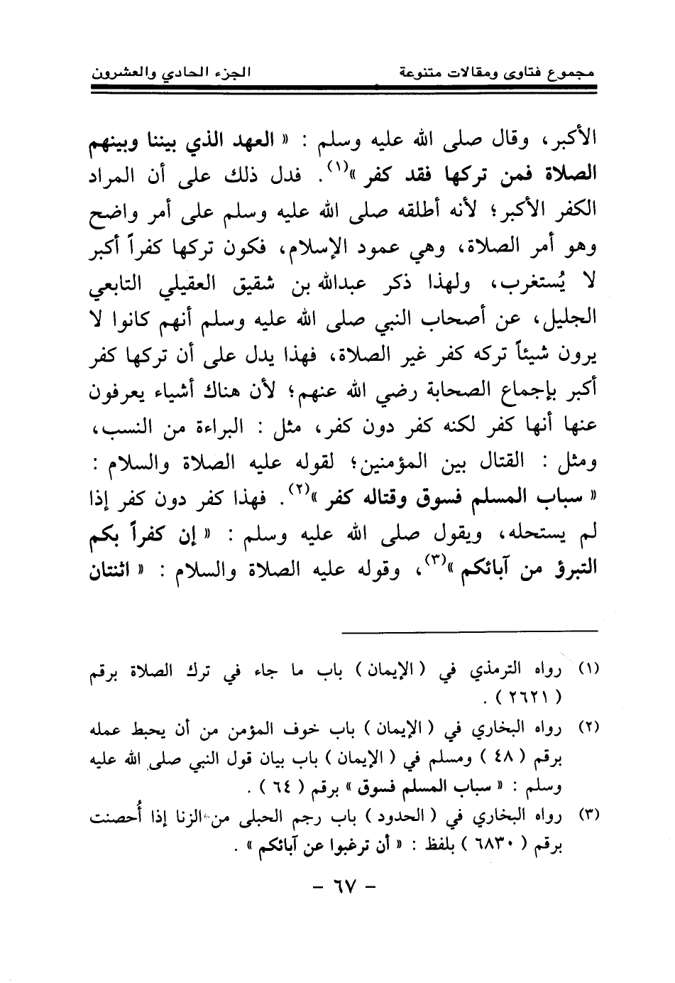 الأكبر، وقال صلى الله عليه وسلم: «العهد الذي بيننا وبينهم الصلاة فمن تركها فقد كفر (¬1) » فدل ذلك على أن المراد الكفر الأكبر؛ لأنه أطلقه صلى الله عليه وسلم على أمر واضح وهو أمر الصلاة، وهي عمود الإسلام، فكون تركها كفرا أكبر لا يستغرب، ولهذا ذكر عبد الله بن شقيق العقيلي التابعي الجليل، عن أصحاب النبي صلى الله عليه وسلم أنهم كانوا لا يرون شيئا تركه كفر غير الصلاة، فهذا يدل على أن تركها كفر أكبر بإجماع الصحابة رضي الله عنهم؛ لأن هناك أشياء يعرفون عنها أنها كفر لكنه كفر دون كفر، مثل: البراءة من النسب، ومثل: القتال بين المؤمنين؛ لقوله عليه الصلاة والسلام: «سباب المسلم فسوق وقتاله كفر (¬2) » فهذا كفر دون كفر إذا لم يستحله، ويقول صلى الله عليه وسلم: «إن كفرا بكم التبرؤ من آبائكم (¬3) » ، وقوله عليه الصلاة والسلام: «اثنتان