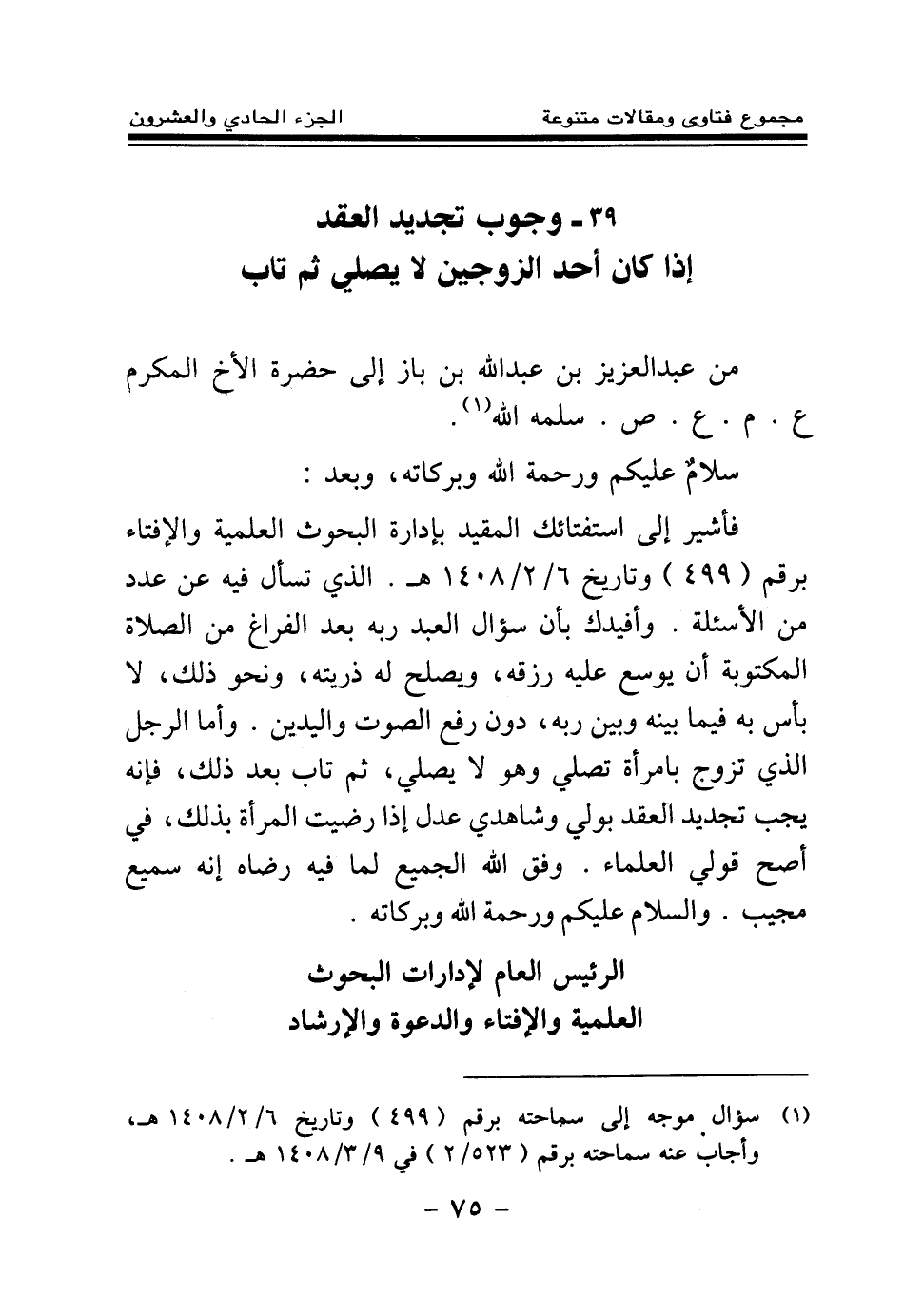 39 - وجوب تجديد العقد إذا كان أحد الزوجين لا يصلي ثم تاب