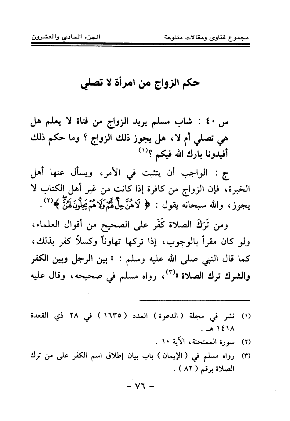 س 40: شاب مسلم يريد الزواج من فتاة لا يعلم هل هي تصلي أم لا، هل يجوز ذلك الزواج؟ وما حكم ذلك أفيدونا بارك الله فيكم؟ (¬1)