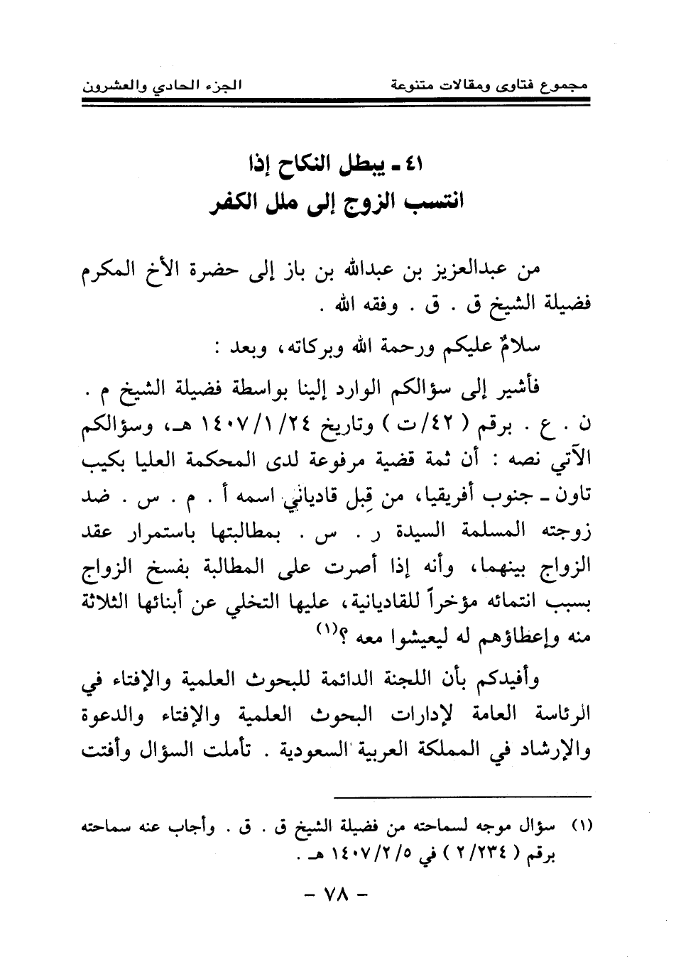 فأشير إلى سؤالكم الوارد إلينا بواسطة فضيلة الشيخ م. ن. ع. برقم (42 \ ت) وتاريخ 24\ 1\ 1407 هـ، وسؤالكم الآتي نصه: أن ثمة قضية مرفوعة لدى المحكمة العليا بكيب تاون - جنوب أفريقيا، من قبل قادياني اسمه أ. م. س. ضد زوجته المسلمة السيدة ر. س. بمطالبتها باستمرار عقد الزواج بينهما، وأنه إذا أصرت على المطالبة بفسخ الزواج بسبب انتمائه مؤخرا للقاديانية، عليها التخلي عن أبنائها الثلاثة منه وإعطاؤهم له ليعيشوا معه؟ (¬1)
