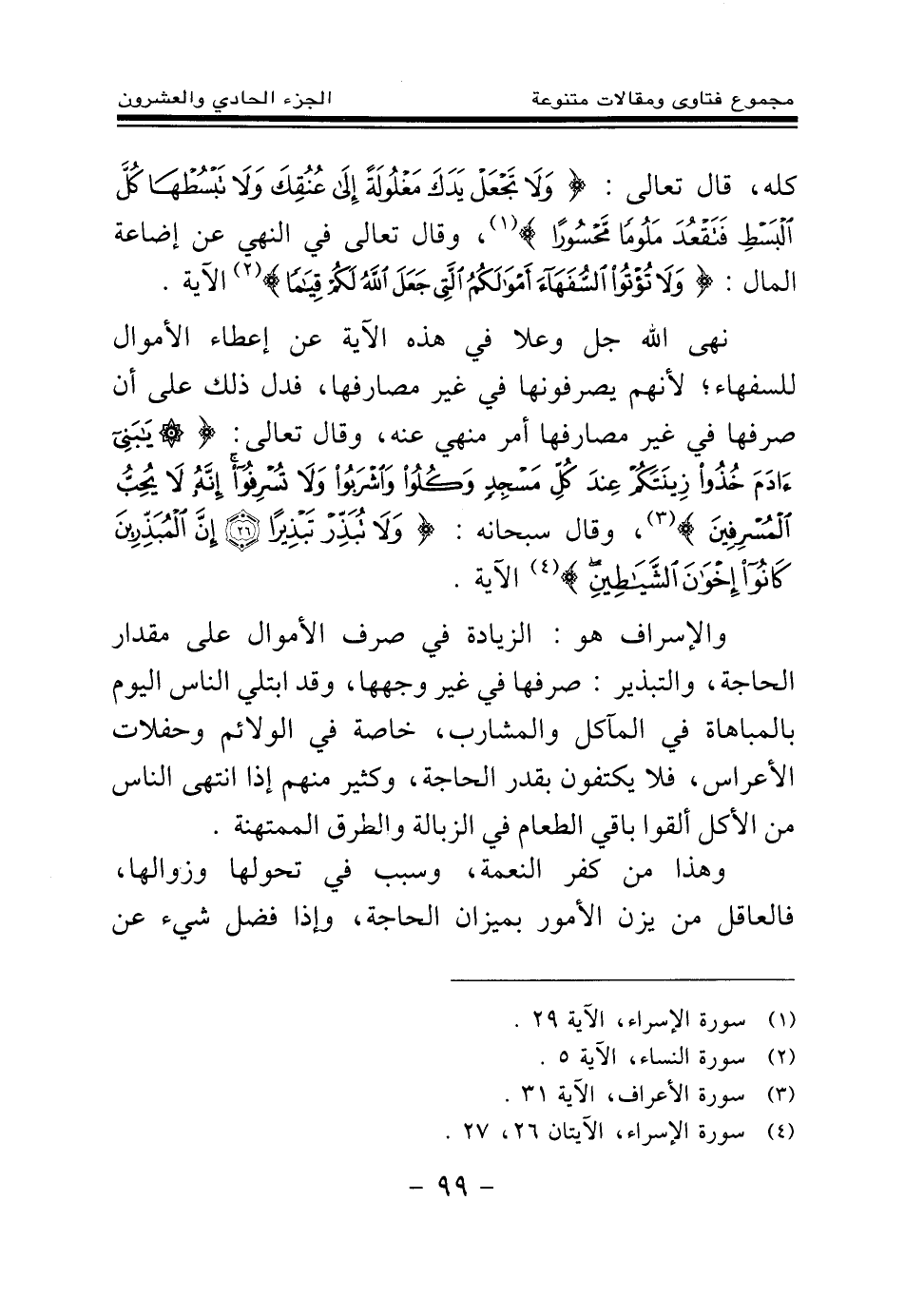 نهى الله جل وعلا في هذه الآية عن إعطاء الأموال للسفهاء؛ لأنهم يصرفونها في غير مصارفها فدل ذلك على أن صرفها في غير مصارفها أمر منهي عنه، وقال تعالى: {يَا بَنِي آدَمَ خُذُوا زِينَتَكُمْ عِنْدَ كُلِّ مَسْجِدٍ وَكُلُوا وَاشْرَبُوا وَلَا تُسْرِفُوا إِنَّهُ لَا يُحِبُّ الْمُسْرِفِينَ} (¬3) وقال سبحانه: {وَلَا تُبَذِّرْ تَبْذِيرًا} (¬4) {إِنَّ الْمُبَذِّرِينَ كَانُوا إِخْوَانَ الشَّيَاطِينِ} (¬5) الآية.