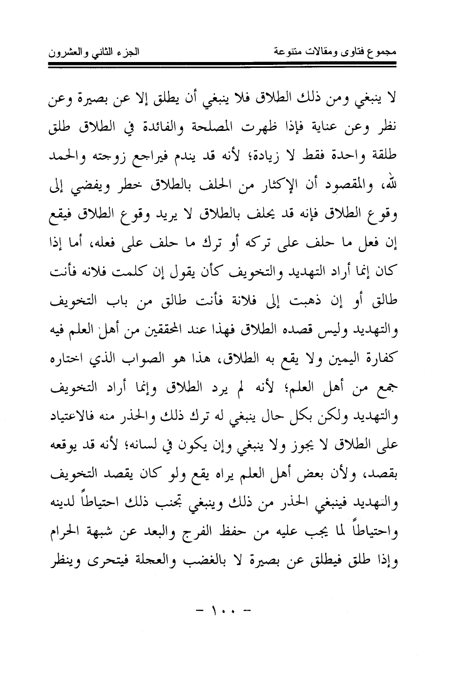 لا ينبغي ومن ذلك الطلاق فلا ينبغي أن يطلق إلا عن بصيرة وعن نظر وعن عناية، فإذا ظهرت المصلحة والفائدة في الطلاق طلق طلقة واحدة فقط لا زيادة، لأنه قد يندم فيراجع زوجته والحمد لله، والمقصود أن الإكثار من الحلف بالطلاق خطر ويفضي إلى وقوع الطلاق، فإنه قد يحلف بالطلاق لا يريد وقوع الطلاق فيقع إن فعل ما حلف على تركه أو ترك ما حلف على فعله، أما إذا كان إنما أراد التهديد والتخويف كأن يقول إن كلمت فلانة فأنت طالق أو إن ذهبت إلى فلانة فأنت طالق من باب التخويف والتهديد وليس قصده الطلاق فهذا عند المحققين من أهل العلم فيه كفارة اليمين ولا يقع به الطلاق، هذا هو الصواب الذي اختاره جمع من أهل العلم، لأنه لم يرد الطلاق وإنما أراد التخويف والتهديد ولكن بكل حال ينبغي له ترك ذلك والحذر منه فالاعتياد على الطلاق لا يجوز ولا ينبغي وإن يكون في لسانه؛ لأنه قد يوقعه بقصد، ولأن بعض أهل العلم يراه يقع ولو كان يقصد التخويف والتهديد فينبغي الحذر من ذلك وينبغي تجنب ذلك احتياطا لدينه واحتياطا لما يجب عليه من حفظ الفرج والبعد عن شبهة الحرام وإذا طلق فيطلق عن بصيرة لا بالغضب والعجلة فيتحرى وينظر