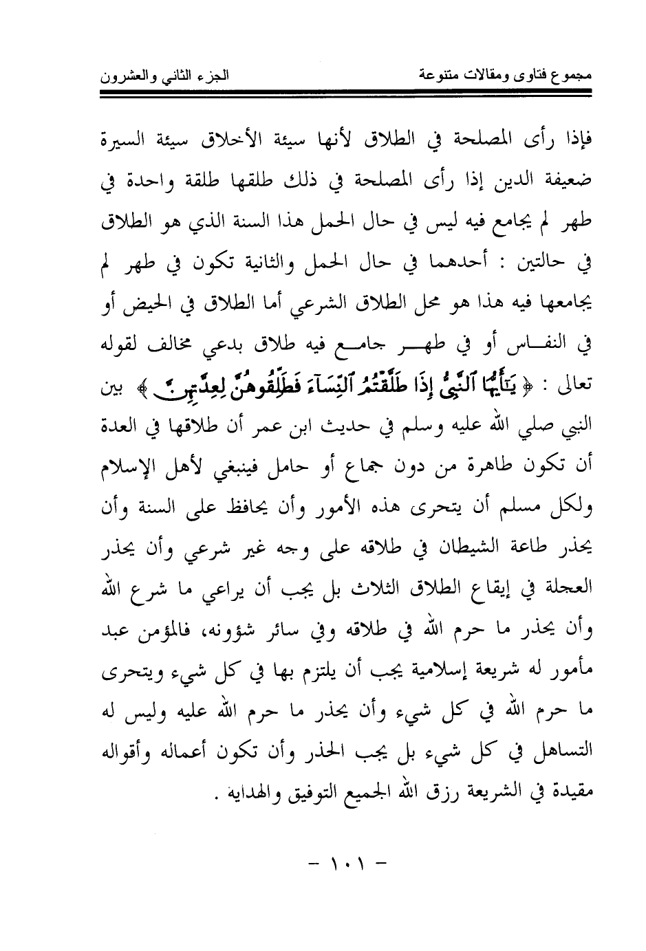 فإذا رأى المصلحة في الطلاق لأنها سيئة الأخلاق سيئة السيرة ضعيفة الدين إذا رأى المصلحة في ذلك طلقها طلقة واحدة في طهر لم يجامع فيه ليس في حال الحمل هذا السنة الذي هو الطلاق في حالتين: أحدهما في حال الحمل والثانية تكون في طهر لم يجامعها فيه هذا هو محل الطلاق الشرعي أما الطلاق في الحيض أو في النفاس أو في طهر جامع فيه طلاق بدعي مخالف لقوله تعالى: {يَا أَيُّهَا النَّبِيُّ إِذَا طَلَّقْتُمُ النِّسَاءَ فَطَلِّقُوهُنَّ لِعِدَّتِهِنَّ} (¬1) بين النبي صلى الله عليه وسلم في حديث ابن عمر أن طلاقها في العدة أن تكون طاهرة من دون جماع أو حامل فينبغي لأهل الإسلام ولكل مسلم أن يتحرى هذه الأمور وأن يحافظ على السنة وأن يحذر طاعة الشيطان في طلاقه على وجه غير شرعي وأن يحذر العجلة في إيقاع الطلاق الثلاث بل يجب أن يراعي ما شرع الله، وأن يحذر ما حرم الله في طلاقه وفي سائر شؤونه، فالمؤمن عبد مأمور له شريعة إسلامية يجب أن يلتزم بها في كل شيء ويتحرى ما حرم الله في كل شيء، وأن يحذر ما حرم الله عليه وليس له التساهل في كل شيء بل يجب الحذر، وأن تكون أعماله وأقواله مقيدة في الشريعة، رزق الله الجميع التوفيق والهداية.