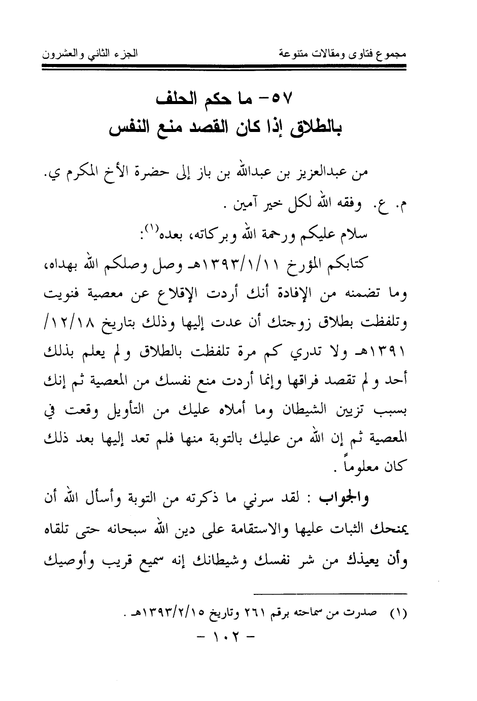 كتابكم المؤرخ 11 \ 1 \ 1393 هـ وصل وصلكم الله بهداه، وما تضمنه من الإفادة أنك أردت الإقلاع عن معصية فنويت وتلفظت بطلاق زوجتك أن عدت إليها وذلك بتاريخ 18 \ 12 \ 1391هـ ولا تدري كم مرة تلفظت بالطلاق ولم يعلم بذلك أحد ولم تقصد فراقها وإنما أردت منع نفسك من المعصية ثم إنك بسبب تزيين الشيطان وما أملاه عليك من التأويل وقعت في المعصية، ثم إن الله من عليك بالتوبة منها فلم تعد إليها بعد ذلك كان معلوما.