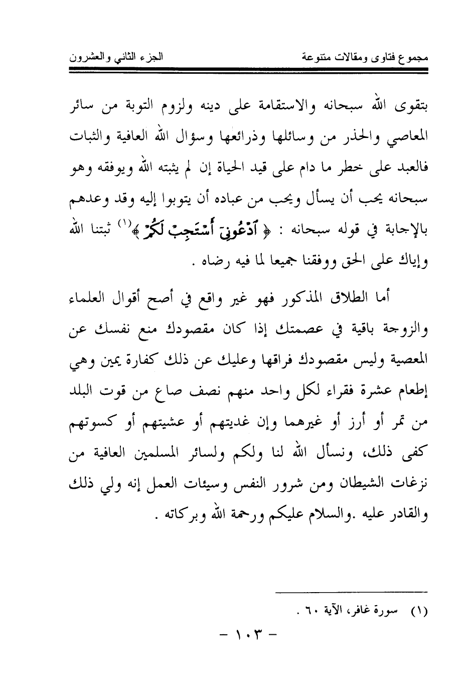 بتقوى الله سبحانه والاستقامة على دينه ولزوم التوبة من سائر المعاصي والحذر من وسائلها وذرائعها وسؤال الله العافية والثبات، فالعبد على خطر ما دام على قيد الحياة إن لم يثبته الله ويوفقه، وهو سبحانه يحب أن يسأل ويحب من عباده أن يتوبوا إليه وقد وعدهم بالإجابة في قوله سبحانه: {ادْعُونِي أَسْتَجِبْ لَكُمْ} (¬1) ثبتنا الله وإياك على الحق ووفقنا جميعا لما فيه رضاه.