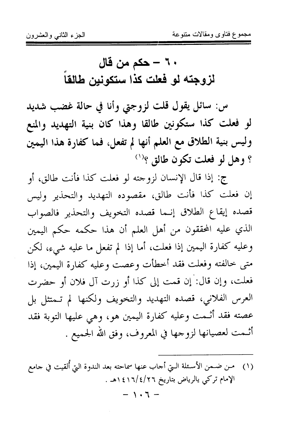 ج: إذا قال الإنسان لزوجته لو فعلت كذا فأنت طالق، أو إن فعلت كذا فأنت طالق، مقصوده التهديد والتحذير وليس قصده إيقاع الطلاق إنما قصده التخويف والتحذير فالصواب الذي عليه المحققون من أهل العلم أن هذا حكمه حكم اليمين وعليه كفارة اليمين إذا فعلت، أما إذا لم تفعل ما عليه شيء، لكن متى خالفته وفعلت فقد أخطأت وعصت وعليه كفارة اليمين، إذا فعلت، وإن قال: إن قمت إلى كذا أو زرت آل فلان أو حضرت العرس الفلاني، قصده التهديد والتخويف ولكنها لم تمتثل بل عصته فقد أثمت وعليه كفارة اليمين هو، وهي عليها التوبة فقد أثمت لعصيانها لزوجها في المعروف، وفق الله الجميع.
