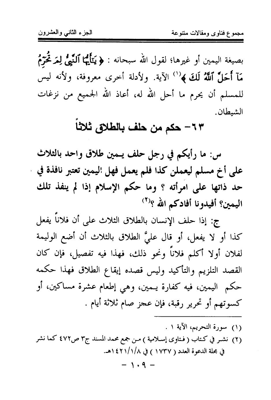 بصيغة اليمين أو غيرها؛ لقول الله سبحانه: {يَا أَيُّهَا النَّبِيُّ لِمَ تُحَرِّمُ مَا أَحَلَّ اللَّهُ لَكَ} (¬1) الآية. ولأدلة أخرى معروفة، ولأنه ليس للمسلم أن يحرم ما أحل الله له، أعاذ الله الجميع من نزغات الشيطان.
