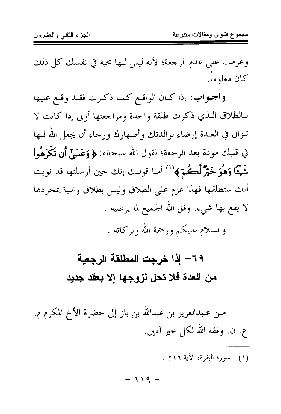 والجواب: إذا كان الواقع كما ذكرت فقد وقع عليها بالطلاق الذي ذكرت طلقة واحدة ومراجعتها أولى إذا كانت لا تزال في العدة إرضاء لوالدتك وأصهارك ورجاء أن يجعل الله لها في قلبك مودة بعد الرجعة؛ لقول الله سبحانه: {وَعَسَى أَنْ تَكْرَهُوا شَيْئًا وَهُوَ خَيْرٌ لَكُمْ} (¬1) أما قولك إنك حين أرسلتها قد نويت أنك ستطلقها فهذا عزم على الطلاق وليس بطلاق والنية بمجردها لا يقع بها شيء. وفق الله الجميع لما يرضيه.