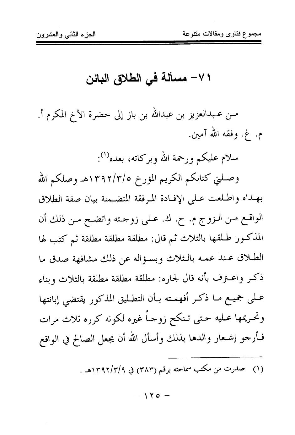 وصلني كتابكم الكريم المؤرخ 5 \ 3 \ 1392 هـ وصلكم الله بهداه، واطلعت على الإفادة المرفقة المتضمنة بيان صفة الطلاق الواقع من الزوج م. ح. ك. على زوجته، واتضح من ذلك أن المذكور طلقها بالثلاث، ثم قال: مطلقة مطلقة مطلقة ثم كتب لها الطلاق عند عمه بالثلاث، وبسؤاله عن ذلك مشافهة صدق ما ذكر واعترف بأنه قال لجاره: مطلقة مطلقة مطلقة بالثلاث
