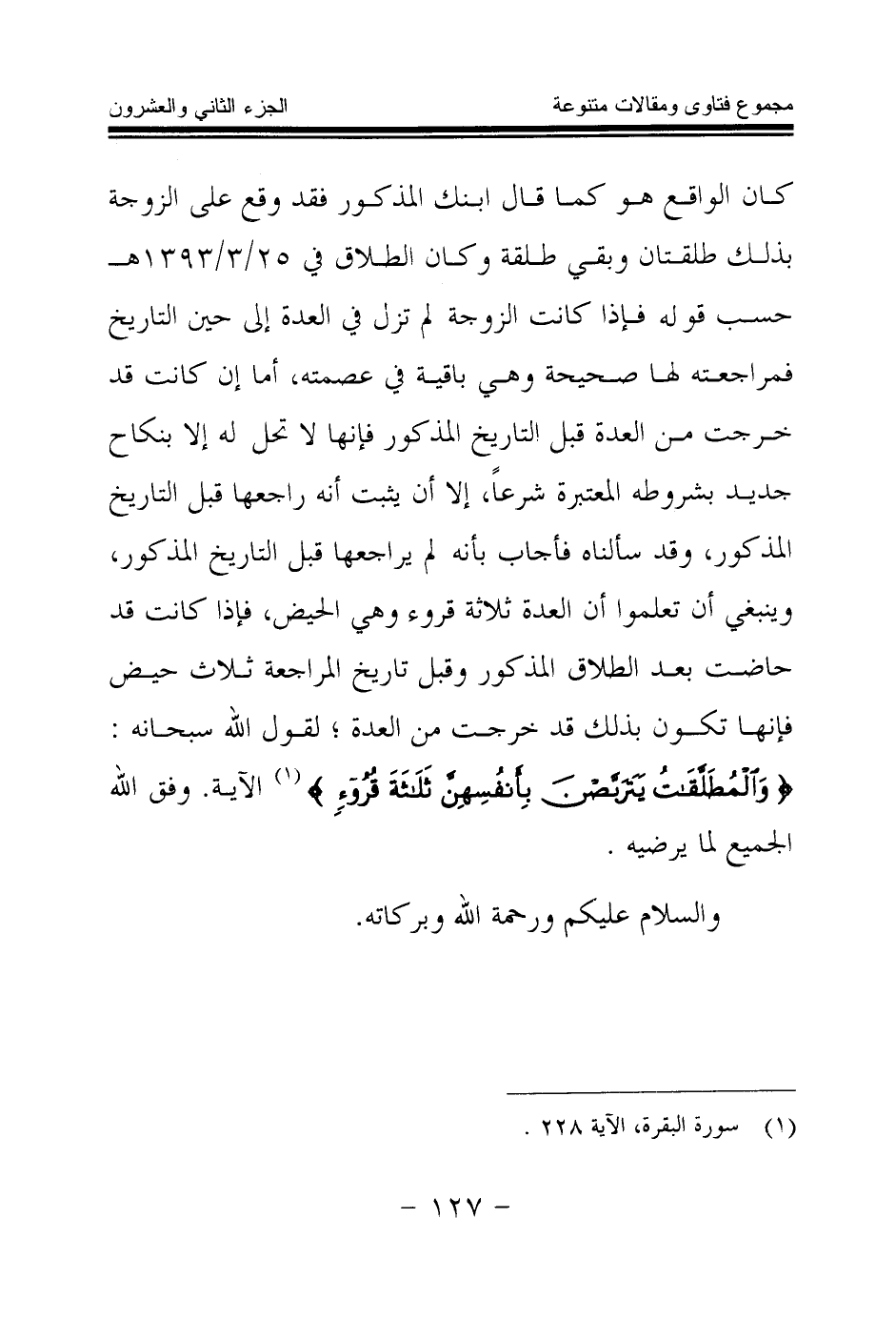 كان الواقع هو كما قال ابنك المذكور فقد وقع على الزوجة بذلك طلقتان، وبقي طلقة وكان الطلاق في 25 \ 3 \ 1393 هـ حسب قوله فإذا كانت الزوجة لم تزل في العدة إلى حين التاريخ فمراجعته لها صحيحة وهي باقية في عصمته، أما إن كانت قد خرجت من العدة قبل التاريخ المذكور فإنها لا تحل له إلا بنكاح جديد بشروطه المعتبرة شرعا، إلا أن يثبت أنه راجعها قبل التاريخ المذكور، وقد سألناه فأجاب بأنه لم يراجعها قبل التاريخ المذكور، وينبغي أن تعلموا أن العدة ثلاثة قروء وهي الحيض، فإذا كانت قد حاضت بعد الطلاق المذكور وقبل تاريخ المراجعة ثلاث حيض فإنها تكون بذلك قد خرجت من العدة؛ لقول الله سبحانه: {وَالْمُطَلَّقَاتُ يَتَرَبَّصْنَ بِأَنْفُسِهِنَّ ثَلَاثَةَ قُرُوءٍ} (¬1) الآية. وفق الله الجميع لما يرضيه.