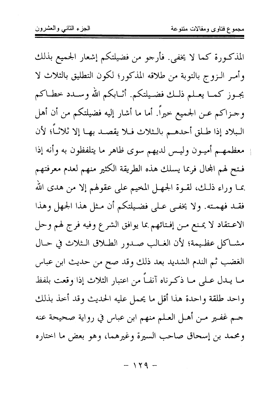 المذكورة كما لا يخفى. فأرجو من فضيلتكم إشعار الجميع بذلك وأمر الزوج بالتوبة من طلاقه المذكور لكون التطليق بالثلاث لا يجوز كما يعلم ذلك فضيلتكم. أثابكم الله وسدد خطاكم وجزاكم عن الجميع خيرا. أما ما أشار إليه فضيلتكم من أن أهل البلاد إذا طلق أحدهم بالثلاث فلا يقصد بها إلا ثلاثا؛ لأن معظمهم أميون وليس لديهم سوى ظاهر ما يتلفظون به وأنه إذا فتح لهم المجال فربما يسلك هذه الطريقة الكثير منهم لعدم معرفتهم بما وراء ذلك، لقوة الجهل المخيم على عقولهم إلا من هدى الله فقد فهمته ولا يخفى على فضيلتكم أن مثل هذا الجهل وهذا الاعتقاد لا يمنع من إفتائهم بما يوافق الشرع وفيه فرج لهم وحل مشاكل عظيمة؛ لأن الغالب صدور الطلاق الثلاث في حال الغضب ثم الندم الشديد بعد ذلك وقد صح من حديث ابن عباس ما يدل على ما ذكرناه آنفا من اعتبار الثلاث إذا وقعت بلفظ واحد طلقة واحدة هذا أقل ما يحمل عليه الحديث وقد أخذ بذلك جم غفير من أهل العلم منهم ابن عباس في رواية صحيحة عنه ومحمد بن إسحاق صاحب السيرة وغيرهما، وهو بعض ما اختاره