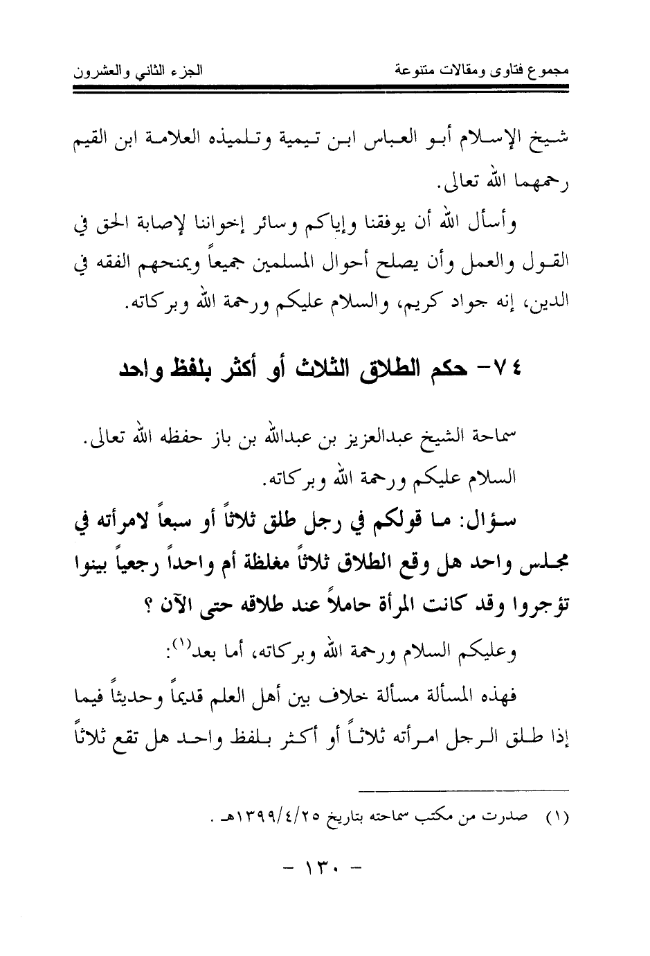 74 - حكم الطلاق الثلاث أو أكثر بلفظ واحد