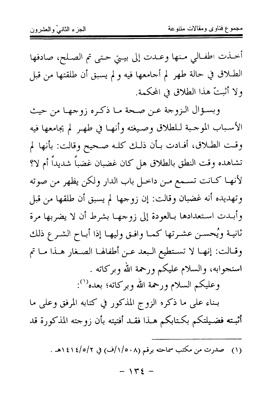 وبسؤال الزوجة عن صحة ما ذكره زوجها من حيث الأسباب الموجبة للطلاق وصيغته وأنها في طهر لم يجامعها فيه وقت الطلاق، أفادت بأن ذلك كله صحيح وقالت: بأنها لم تشاهده وقت النطق بالطلاق هل كان غضبان غضبا شديدا أم لا؛ لأنها كانت تسمع من داخل باب الدار ولكن يظهر من صوته وتهديده أنه غضبان وقالت: إن زوجها لم يسبق أن طلقها من قبل وأبدت استعدادها بالعودة إلى زوجها بشرط أن لا يضربها مرة ثانية ويحسن عشرتها كما وافق وليها إذا أباح الشرع ذلك وقالت: إنها لا تستطيع البعد عن أطفالها الصغار هذا ما تم استجوابه، والسلام عليكم ورحمة الله وبركاته.