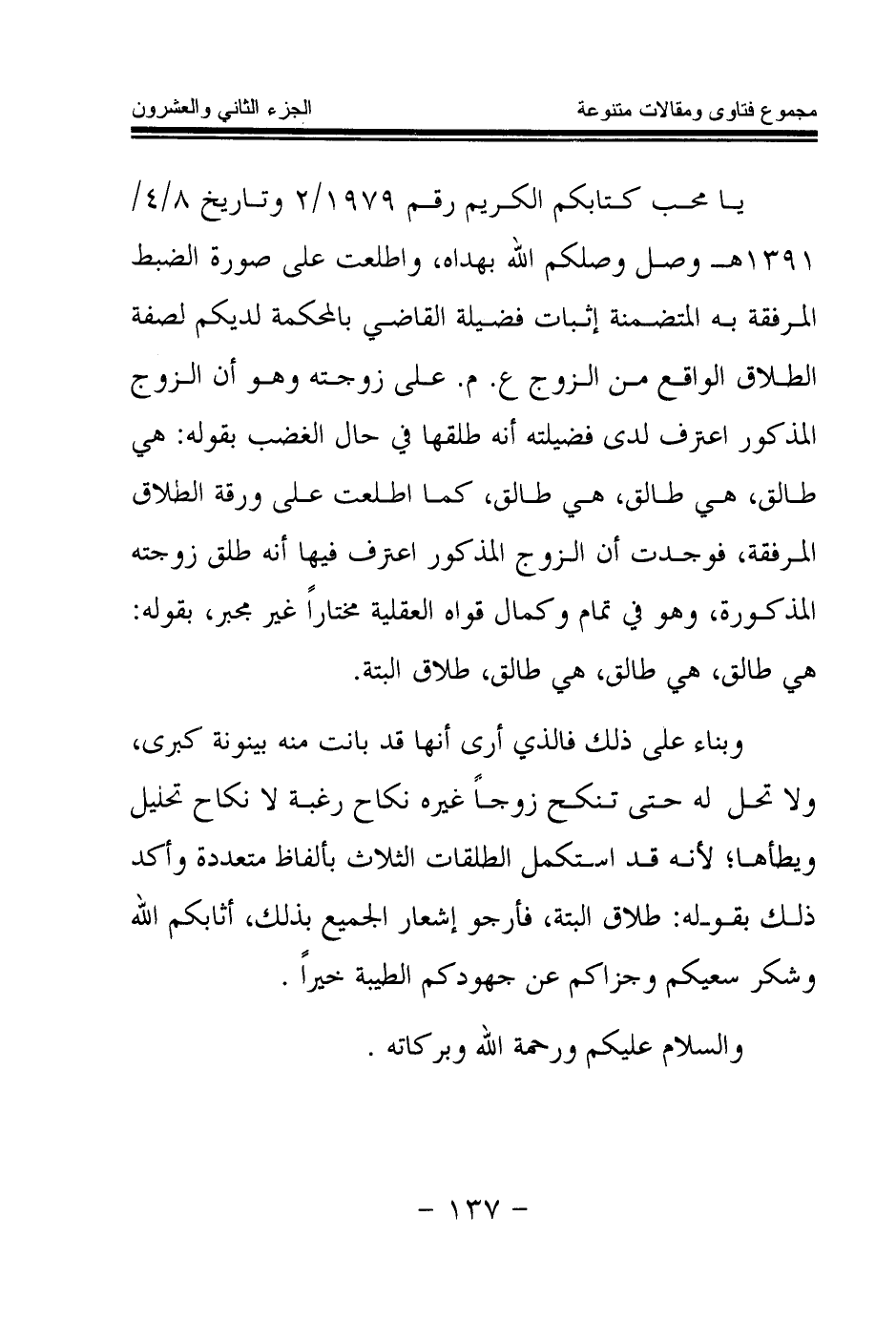 يا محب كتابكم الكريم رقم 1979 \ 2 وتاريخ 8 \ 4 \ 1391هـ وصل وصلكم الله بهداه، واطلعت على صورة الضبط المرفقة به المتضمنة إثبات فضيلة القاضي بالمحكمة لديكم لصفة الطلاق الواقع من الزوج ع. م. على زوجته وهو أن الزوج المذكور اعترف لدى فضيلته أنه طلقها في حال الغضب بقوله: هي طالق، هي طالق، هي طالق، كما اطلعت على ورقة الطلاق المرفقة، فوجدت أن الزوج المذكور اعترف فيها أنه طلق زوجته المذكورة، وهو في تمام وكمال قواه العقلية مختارا غير مجبر، بقوله: هي طالق، هي طالق، هي طالق، طلاق البتة.