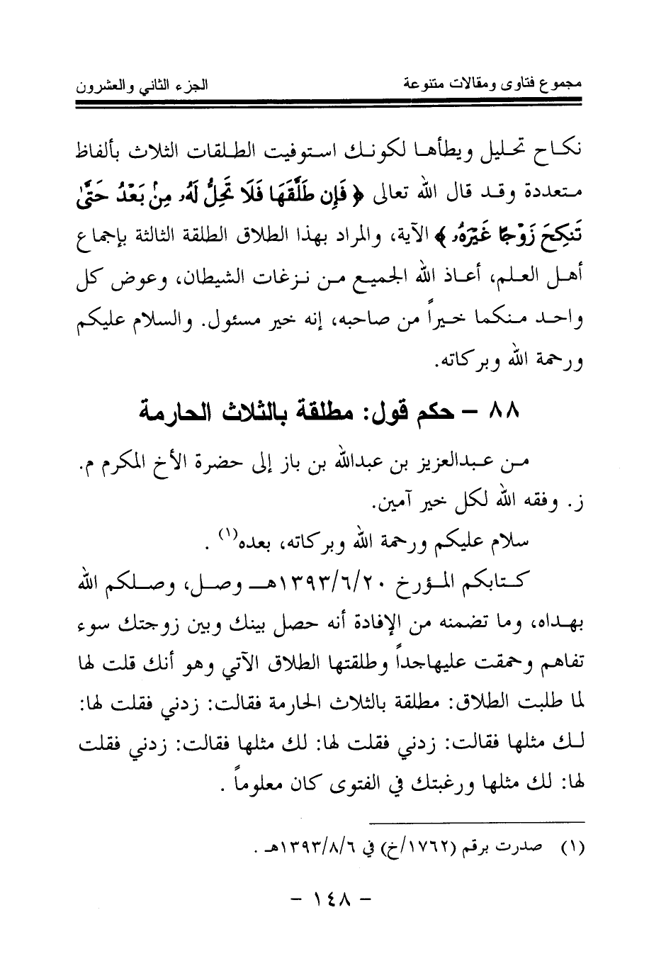 88 - حكم قول: مطلقة بالثلاث الحارمة