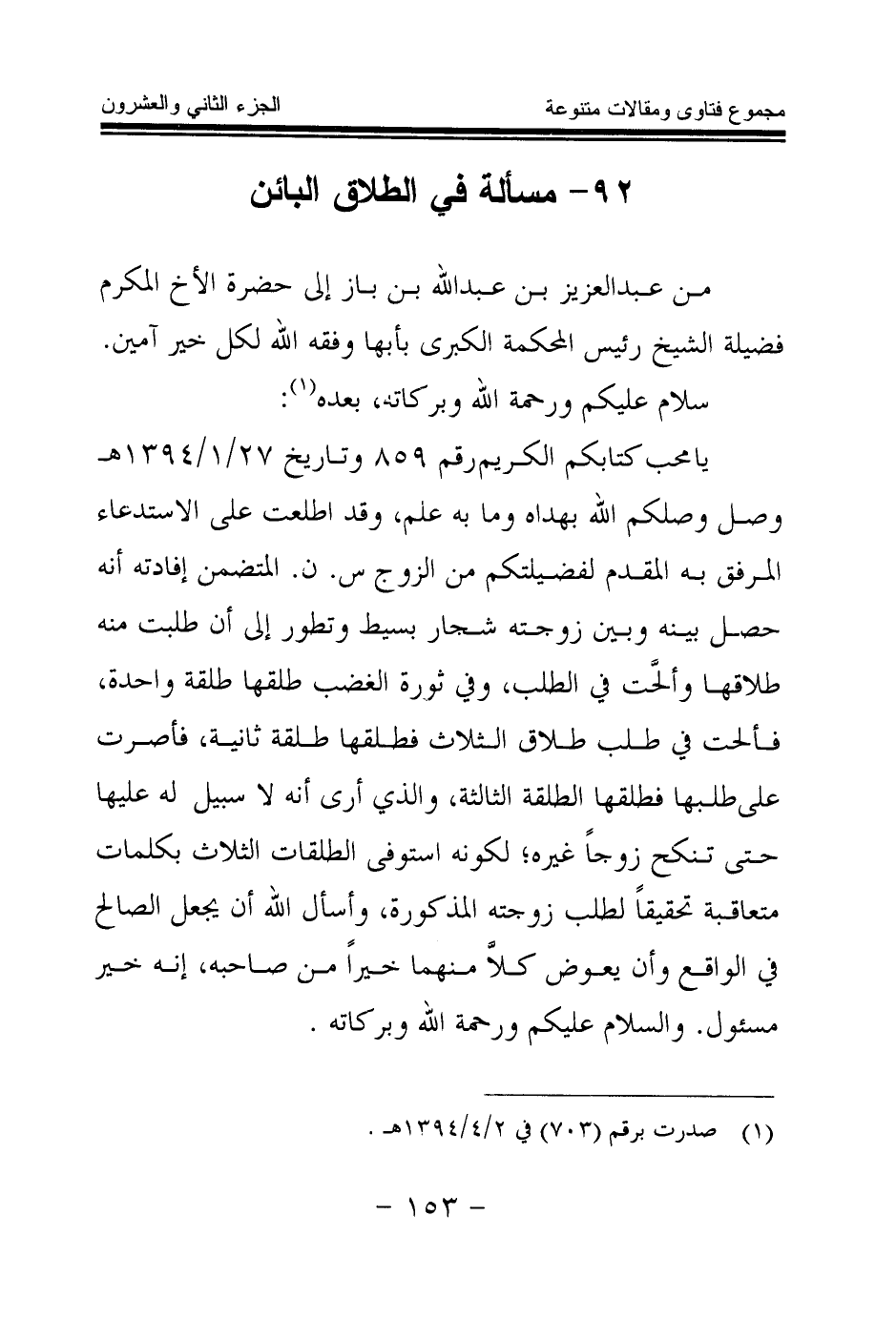 92 - مسألة في الطلاق البائن