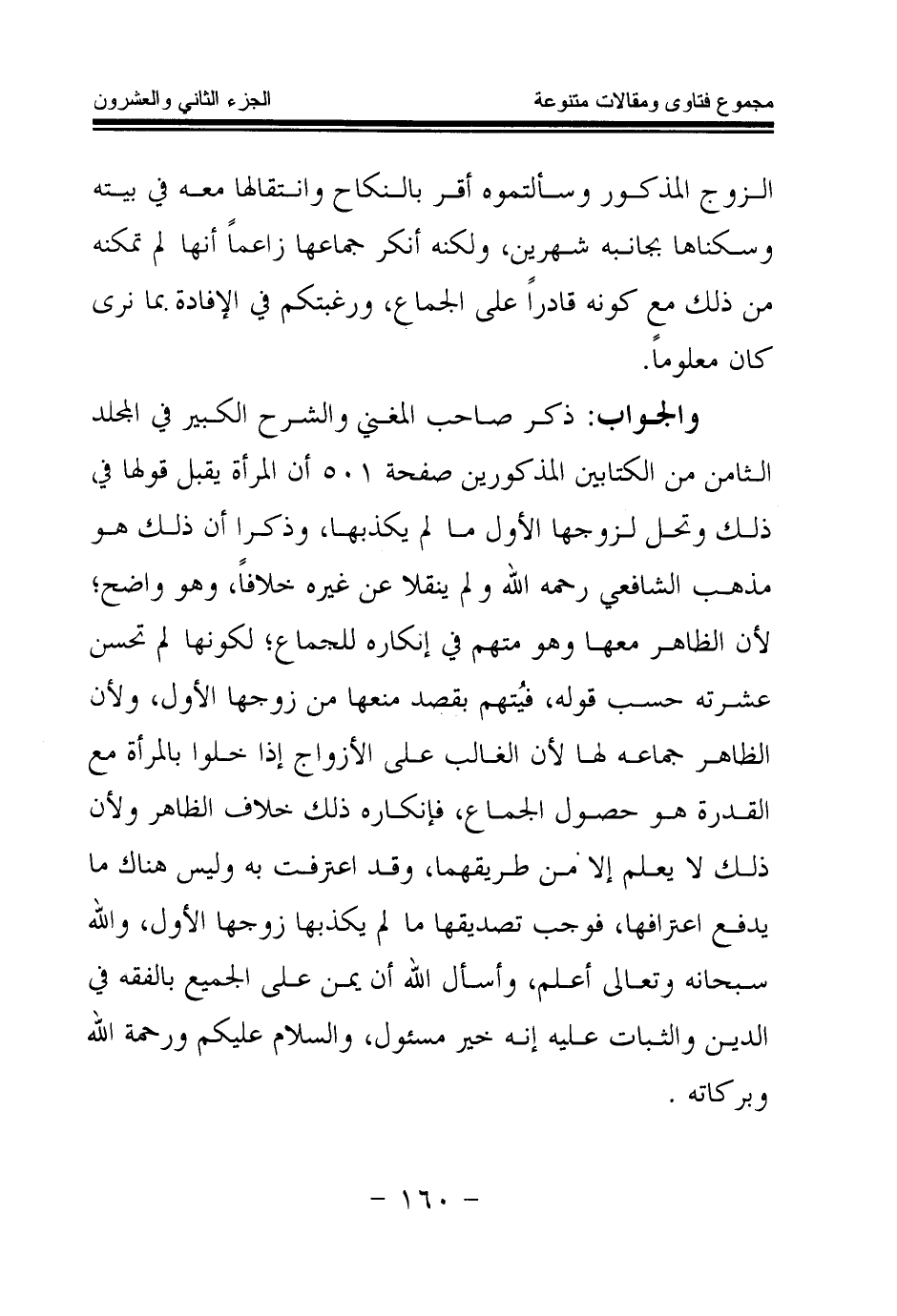 والجواب: ذكر صاحب المغني والشرح الكبير في المجلد الثامن من الكتابين المذكورين صفحة 501 أن المرأة يقبل قولها في ذلك وتحل لزوجها الأول ما لم يكذبها، وذكرا أن ذلك هو مذهب الشافعي - رحمه الله - ولم ينقلا عن غيره خلافا، وهو واضح، لأن الظاهر معها وهو متهم في إنكاره للجماع؛ لكونها لم تحسن عشرته حسب قوله، فيتهم بقصد منعها من زوجها الأول، ولأن الظاهر جماعه لها؛ لأن الغالب على الأزواج إذا خلوا بالمرأة مع القدرة هو حصول الجماع، فإنكاره ذلك خلاف الظاهر؛ ولأن ذلك لا يعلم إلا من طريقهما، وقد اعترفت به وليس هناك ما يدفع اعترافها، فوجب تصديقها ما لم يكذبها زوجها الأول، والله سبحانه وتعالى أعلم، وأسأل الله أن يمن على الجميع بالفقه في الدين والثبات عليه إنه خير مسئول، والسلام عليكم ورحمة الله وبركاته.