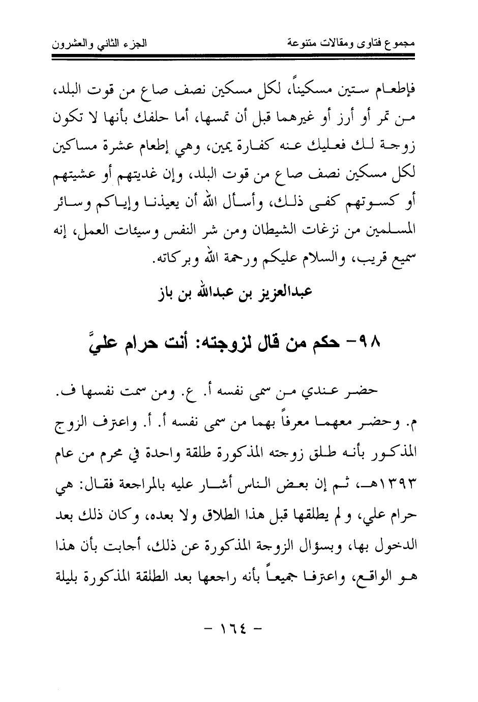 فإطعام ستين مسكينا، لكل مسكين نصف صاع من قوت البلد، من تمر أو أرز أو غيرهما قبل أن تمسها، أما حلفك بأنها لا تكون زوجة لك فعليك عنه كفارة يمين، وهي إطعام عشرة مساكين لكل مسكين نصف صاع من قوت البلد، وإن غديتهم أو عشيتهم أو كسوتهم كفى ذلك، وأسأل الله أن يعيذنا وإياكم وسائر المسلمين من نزغات الشيطان ومن شر النفس وسيئات العمل، إنه سميع قريب، والسلام عليكم ورحمة الله وبركاته.