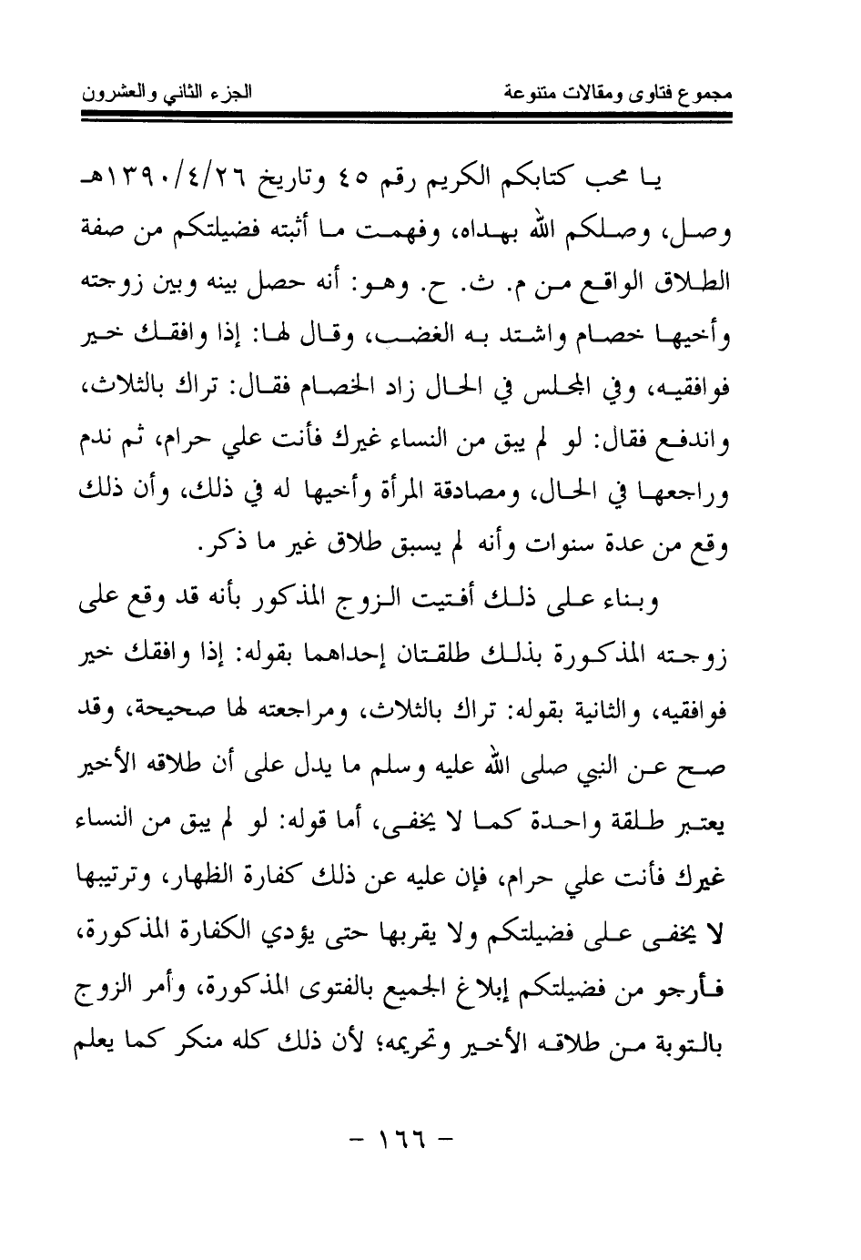 يا محب كتابكم الكريم رقم 45 وتاريخ 26 \ 4 \ 1390هـ وصل، وصلكم الله بهداه، وفهمت ما أثبته فضيلتكم من صفة الطلاق الواقع من م. ث. ح. وهو: أنه حصل بينه وبين زوجته وأخيها خصام واشتد به الغضب، وقال لها: إذا وافقك خير فوافقيه، وفي المجلس في الحال زاد الخصام فقال: تراك بالثلاث، واندفع فقال: لو لم يبق من النساء غيرك فأنت علي حرام، ثم ندم وراجعها في الحال، ومصادقة المرأة وأخيها له في ذلك، وأن ذلك وقع من عدة سنوات وأنه لم يسبق طلاق غير ما ذكر.