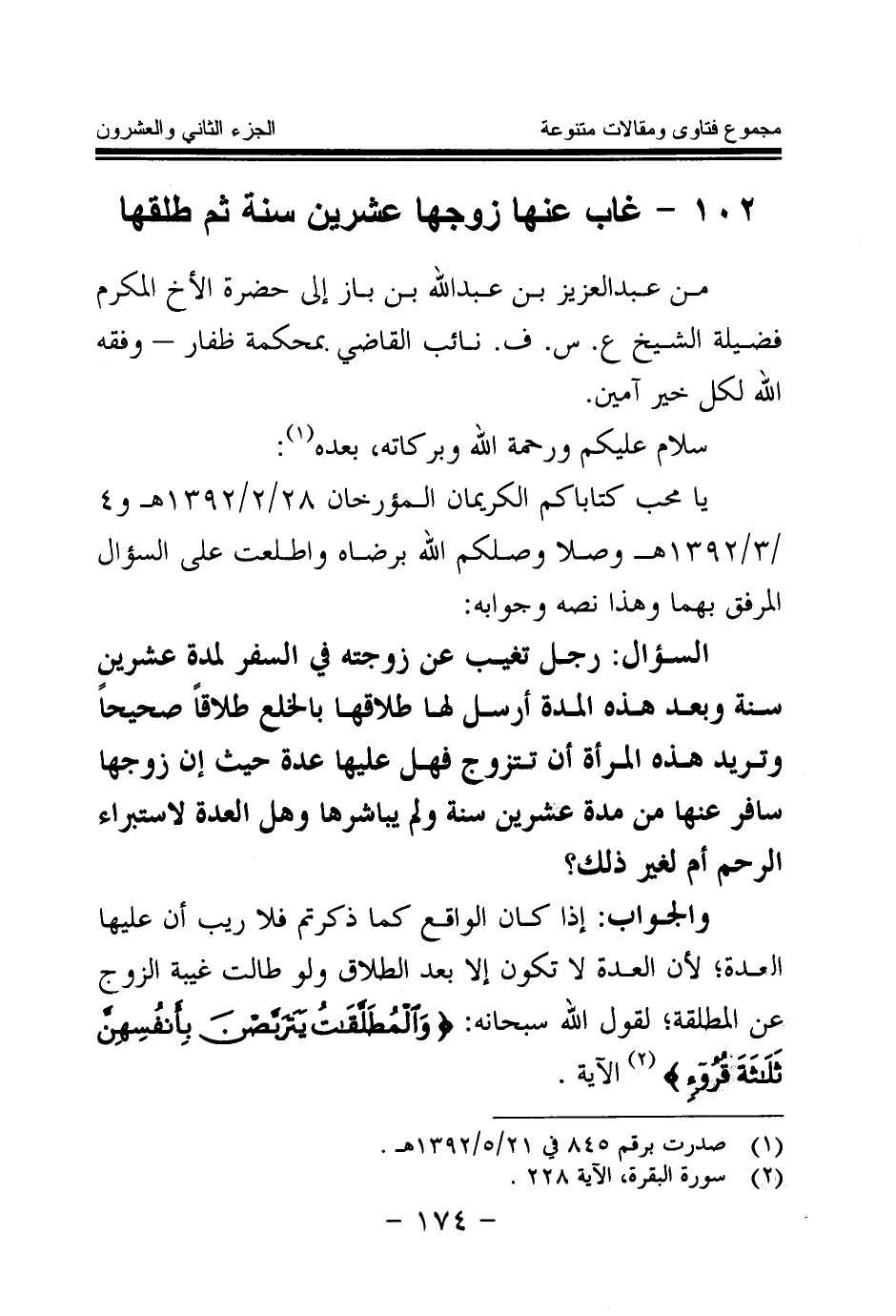 والجواب: إذا كان الواقع كما ذكرتم فلا ريب أن عليها العدة؛ لأن العدة لا تكون إلا بعد الطلاق ولو طالت غيبة الزوج عن المطلقة؟ لقول الله سبحانه: {وَالْمُطَلَّقَاتُ يَتَرَبَّصْنَ بِأَنْفُسِهِنَّ ثَلَاثَةَ قُرُوءٍ} (¬2)