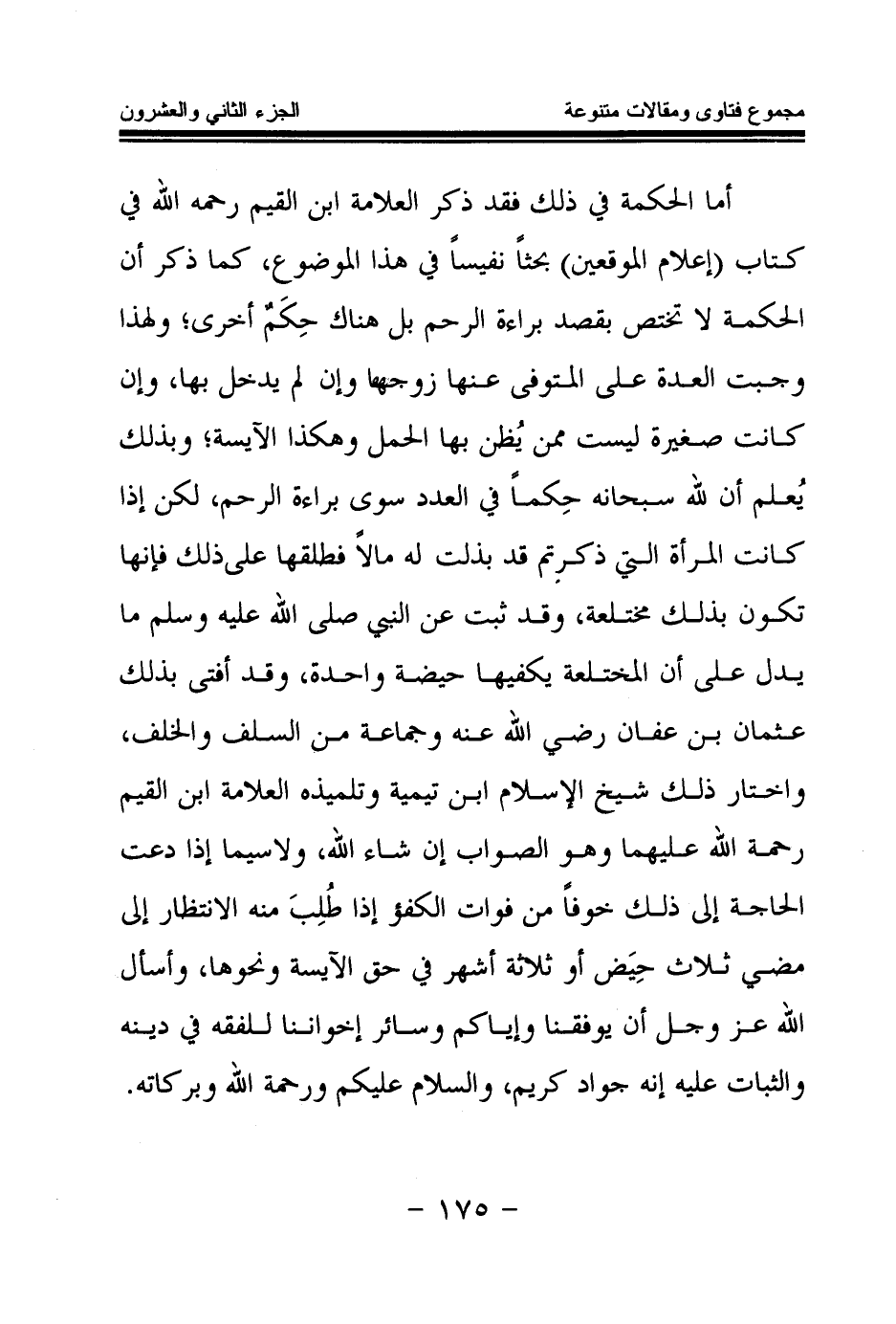 أما الحكمة في ذلك فقد ذكر العلامة ابن القيم - رحمه الله - في كتاب (إعلام الموقعين) بحثا نفيسا في هذا الموضوع، كما ذكر أن الحكمة لا تختص بقصد براءة الرحم بل هناك حكم أخرى؛ ولهذا وجبت العدة على المتوفى عنها زوجها وإن لم يدخل بها، وإن كانت صغيرة ليست ممن يظن بها الحمل وهكذا الآيسة؛ وبذلك يعلم أن لله سبحانه حكما في العدد سوى براءة الرحم، لكن إذا كانت المرأة التي ذكرتم قد بذلت له مالا فطلقها على ذلك فإنها تكون بذلك مختلعة، وقد ثبت عن النبي - صلى الله عليه وسلم - ما يدل على أن المختلعة يكفيها حيضة واحدة، وقد أفتى بذلك عثمان بن عفان - رضي الله عنه - وجماعة من السلف والخلف، واختار ذلك شيخ الإسلام ابن تيمية وتلميذه العلامة ابن القيم - رحمة الله عليهما - وهو الصواب إن شاء الله، ولا سيما إذا دعت الحاجة إلى ذلك خوفا من فوات الكفء إذا طلب منه الانتظار إلى مضي ثلاث حيض أو ثلاثة أشهر في حق الآيسة ونحوها، وأسأل الله عز وجل أن يوفقنا وإياكم وسائر إخواننا للفقه في دينه والثبات عليه إنه جواد كريم، والسلام عليكم ورحمة الله وبركاته.