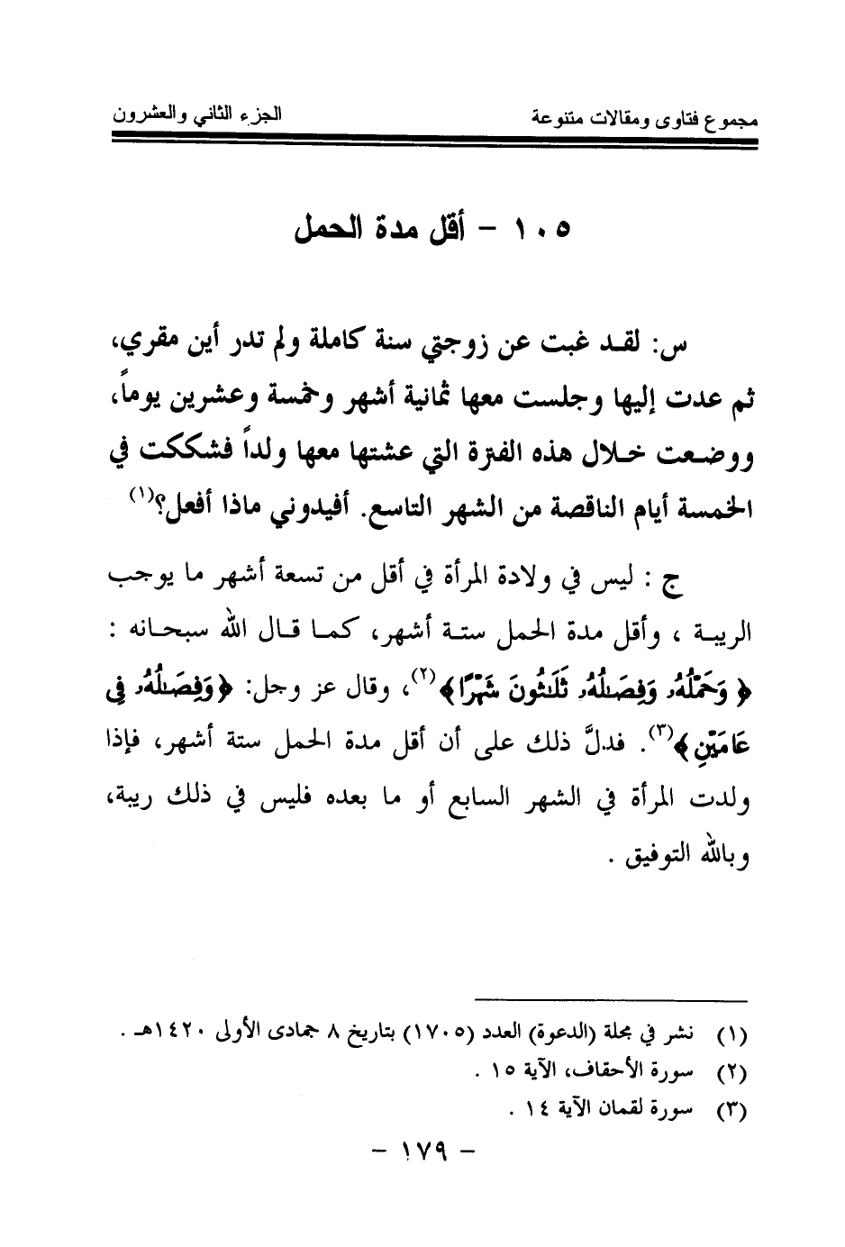 ج: ليس في ولادة المرأة في أقل من تسعة أشهر ما يوجب الريبة، وأقل مدة الحمل ستة أشهر، كما قال الله سبحانه: {وَحَمْلُهُ وَفِصَالُهُ ثَلَاثُونَ شَهْرًا} (¬2) وقال عز وجل: {وَفِصَالُهُ فِي عَامَيْنِ} (¬3) فدل ذلك على أن أقل مدة الحمل ستة أشهر، فإذا ولدت المرأة في الشهر السابع أو ما بعده فليس في ذلك ريبة، وبالله التوفيق.