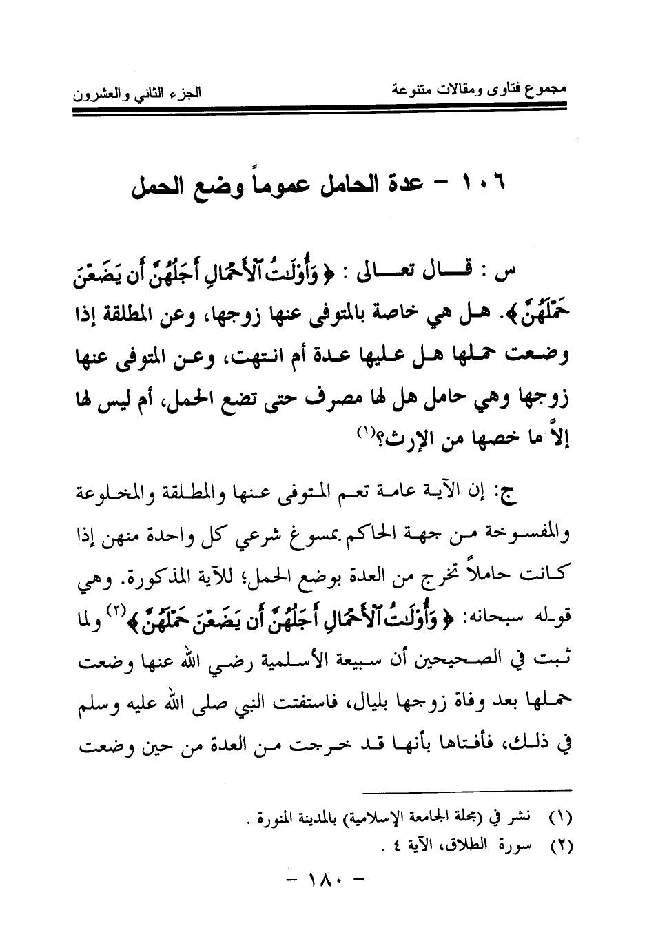 س: قال تعالى: {وَأُولَاتُ الْأَحْمَالِ أَجَلُهُنَّ أَنْ يَضَعْنَ حَمْلَهُنَّ} (¬1) هل هي خاصة بالمتوفى عنها زوجها، وعن المطلقة إذا وضعت حملها هل عليها عدة أم انتهت، وعن المتوفى عنها زوجها وهي حامل هل لها مصرف حتى تضع الحمل، أم ليس لها إلا ما خصها من الإرث؟ (¬2)