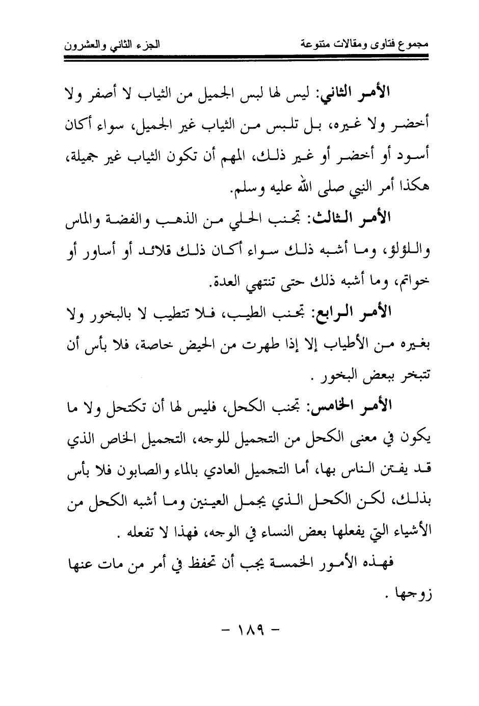 الأمر الخامس: تجنب الكحل، فليس لها أن تكتحل ولا ما يكون في معنى الكحل من التجميل للوجه، التجميل الخاص الذي قد يفتن الناس بها، أما التجميل العادي بالماء والصابون فلا بأس بذلك، لكن الكحل الذي يجمل العينين وما أشبه الكحل من الأشياء التي يفعلها بعض النساء في الوجه، فهذا لا تفعله.