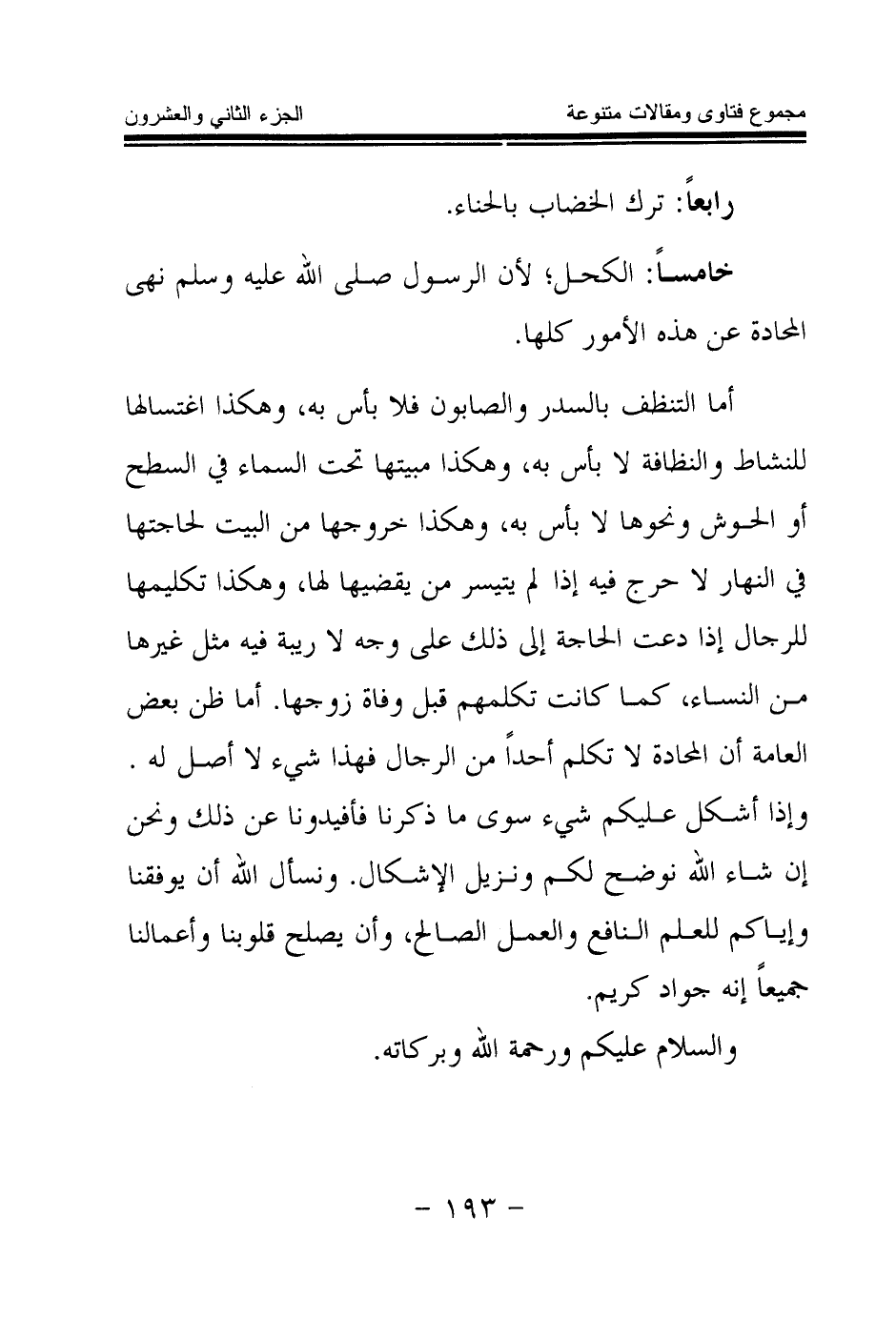 أما التنظف بالسدر والصابون فلا بأس به، وهكذا اغتسالها للنشاط والنظافة لا بأس به، وهكذا مبيتها تحت السماء في السطح أو الحوش ونحوها لا بأس به، وهكذا خروجها من البيت لحاجتها في النهار لا حرج فيه إذا لم يتيسر من يقضيها لها، وهكذا تكليمها للرجال إذا دعت الحاجة إلى ذلك على وجه لا ريبة فيه مثل غيرها من النساء، كما كانت تكلمهم قبل وفاة زوجها. أما ظن بعض العامة أن المحادة لا تكلم أحدا من الرجال فهذا شيء لا أصل له. وإذا أشكل عليكم شيء سوى ما ذكرنا فأفيدونا عن ذلك ونحن إن شاء الله نوضح لكم ونزيل الإشكال. ونسأل الله أن يوفقنا وإياكم للعلم النافع والعمل الصالح، وأن يصلح قلوبنا وأعمالنا جميعا إنه جواد كريم.