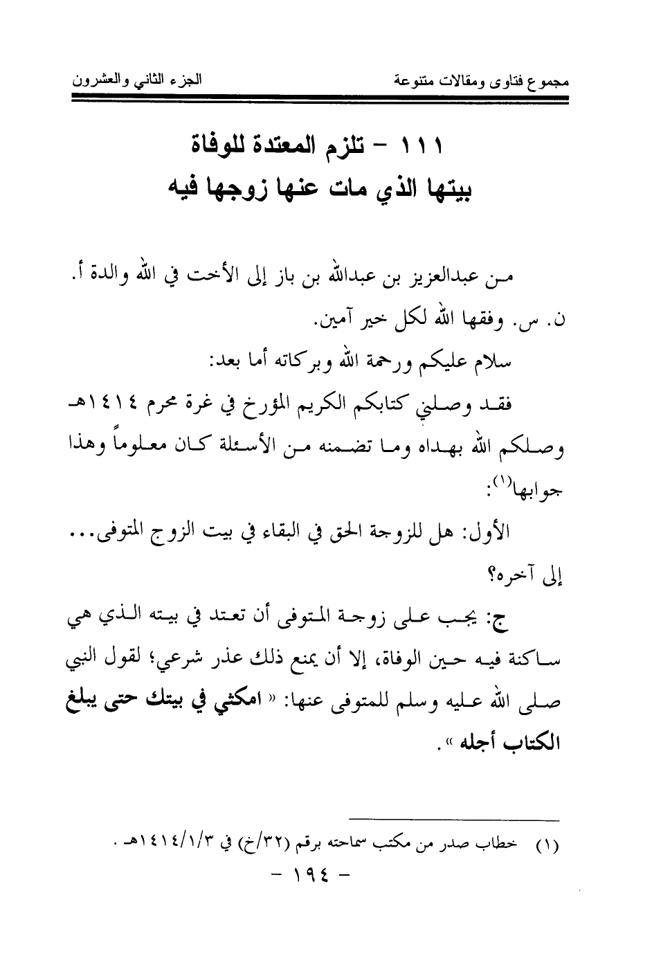 111 - تلزم المعتدة للوفاة بيتها الذي مات عنها زوجها فيه