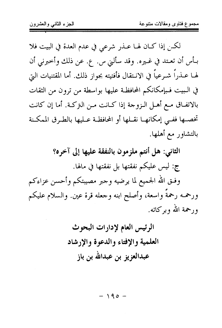 وقد سألني س. ع. عن ذلك وأخبرني أن لها عذرا شرعيا في الانتقال فأفتيته بجواز ذلك. أما المقتنيات التي في البيت فبإمكانكم المحافظة عليها بواسطة من ترون من الثقات بالاتفاق مع أهل الزوجة إذا كانت من التركة. أما إن كانت تخصها ففي إمكانها نقلها أو المحافظة عليها بالطرق الممكنة بالتشاور مع أهلها.