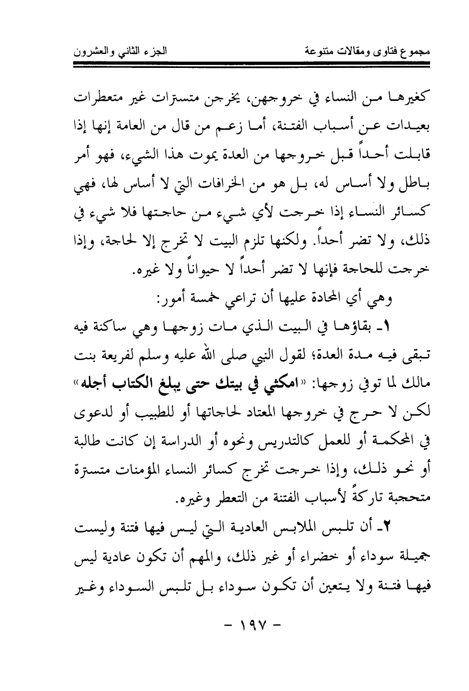 1 - بقاؤها في البيت الذي مات زوجها وهي ساكنة فيه تبقى فيه مدة العدة؛ لقول النبي - صلى الله عليه وسلم - لفريعة بنت مالك لما توفي زوجها: «امكثي في بيتك حتى يبلغ الكتاب أجله (¬1) » لكن لا حرج في خروجها المعتاد لحاجاتها أو للطبيب أو لدعوى في المحكمة أو للعمل كالتدريس ونحوه أو الدراسة إن كانت طالبة أو نحو ذلك، وإذا خرجت تخرج كسائر النساء المؤمنات متسترة متحجبة تاركة لأسباب الفتنة من التعطر وغيره.