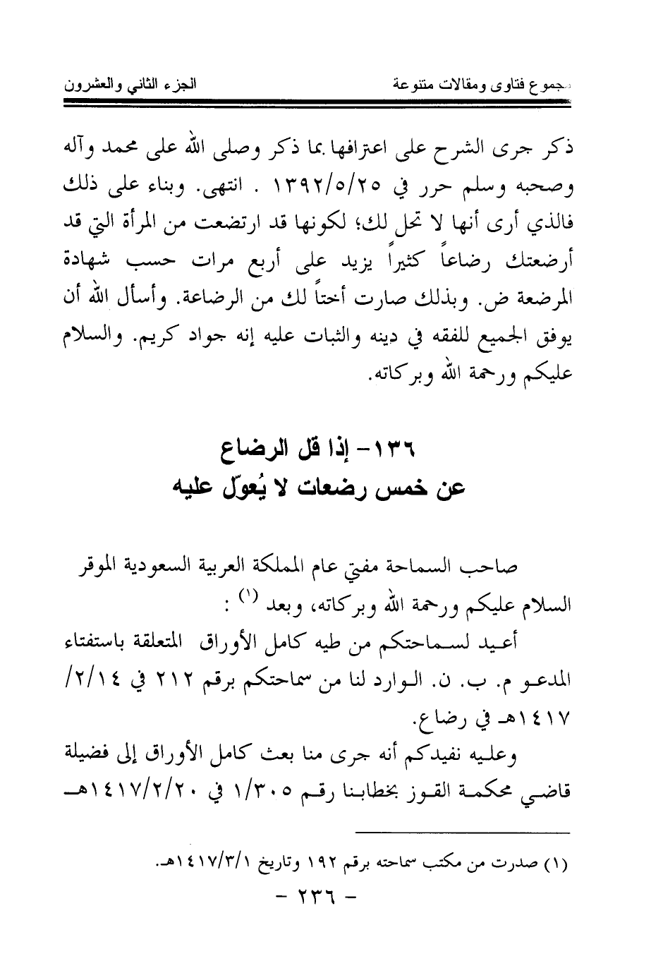 أعيد لسماحتكم من طيه كامل الأوراق المتعلقة باستفتاء المدعو م. ب. ن. الوارد لنا من سماحتكم برقم 212 في 14 \ 2 \ 1417هـ في رضاع.