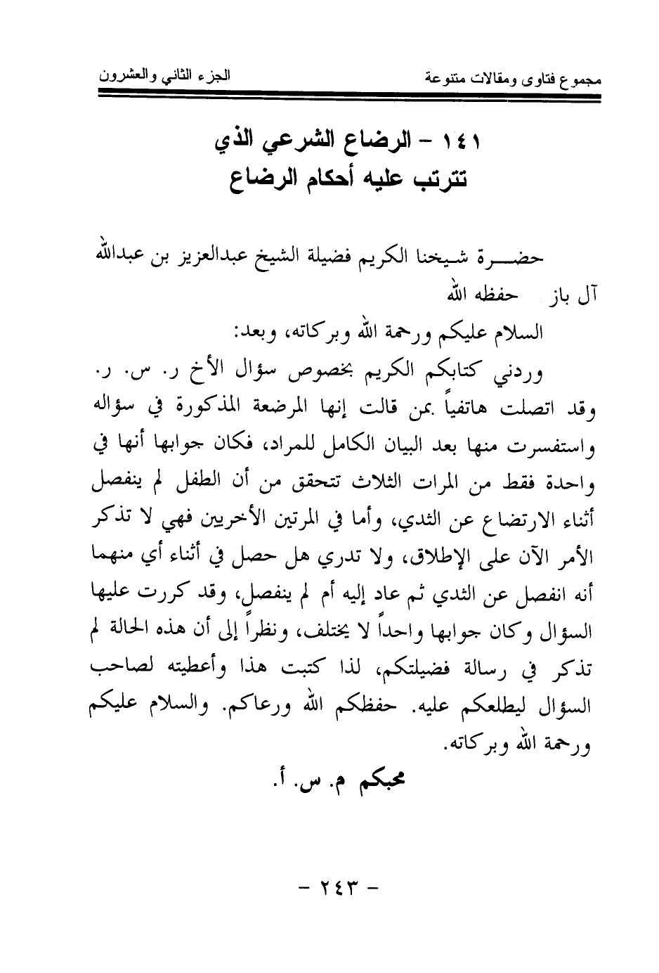 وردني كتابكم الكريم بخصوص سؤال الأخ ر. س. ر. وقد اتصلت هاتفيا بمن قالت إنها المرضعة المذكورة في سؤاله واستفسرت منها بعد البيان الكامل للمراد، فكان جوابها أنها في واحدة فقط من المرات الثلاث تتحقق من أن الطفل لم ينفصل أثناء الارتضاع عن الثدي، وأما في المرتين الأخريين فهي لا تذكر الأمر الآن على الإطلاق، ولا تدري هل حصل في أثناء أي منهما أنه انفصل عن الثدي ثم عاد إليه أم لم ينفصل، وقد كررت عليها السؤال وكان جوابها واحدا لا يختلف، ونظرا إلى أن هذه الحالة لم تذكر في رسالة فضيلتكم، لذا كتبت هذا وأعطيته لصاحب السؤال ليطلعكم عليه. حفظكم الله ورعاكم. والسلام عليكم ورحمة الله وبركاته.