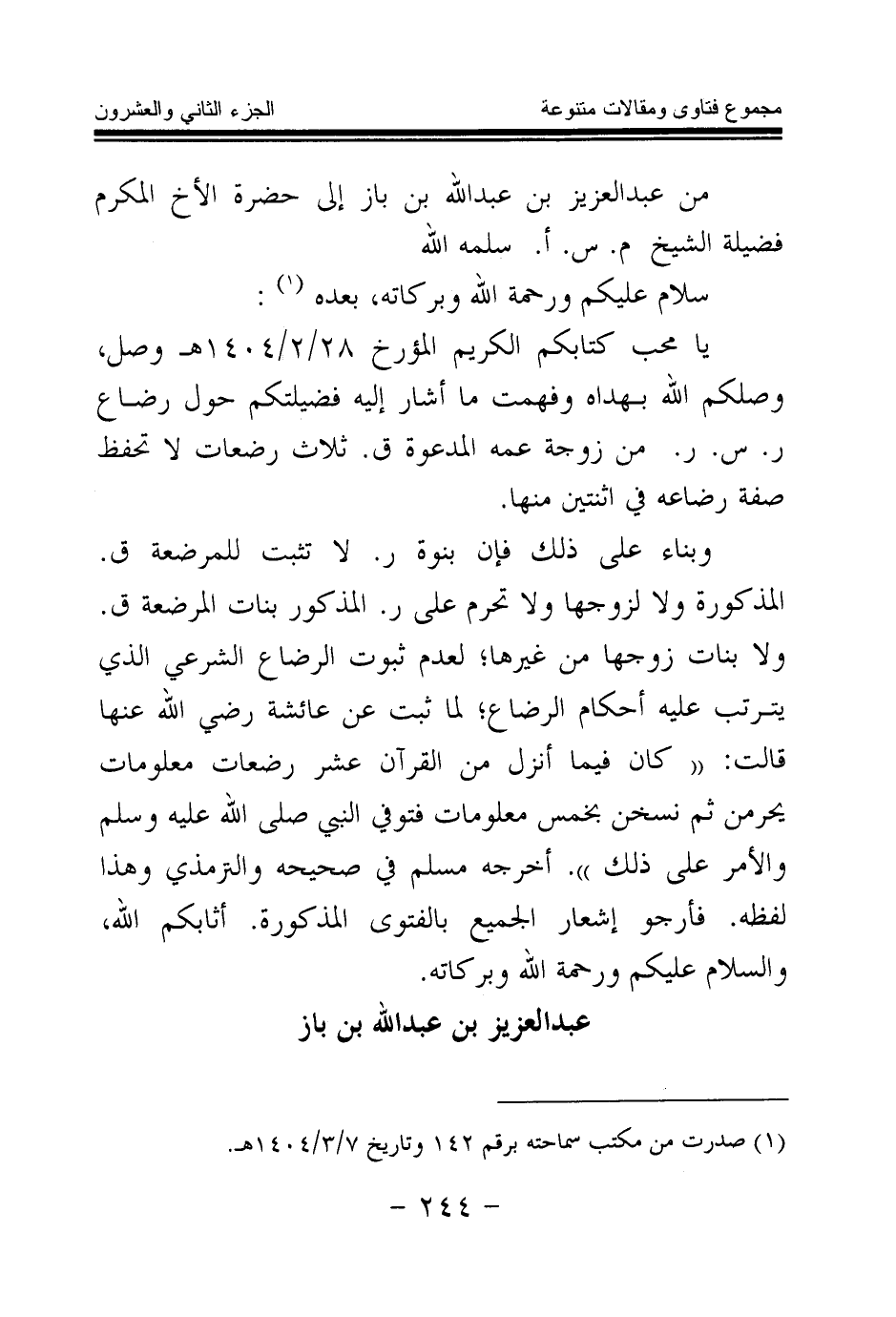 يا محب كتابكم الكريم المؤرخ 28 \ 2 \ 1404هـ وصل، وصلكم الله بهداه وفهمت ما أشار إليه فضيلتكم حول رضاع ر. س. ر. من زوجة عمه المدعوة ق. ثلاث رضعات لا تحفظ صفة رضاعه في اثنتين منها.