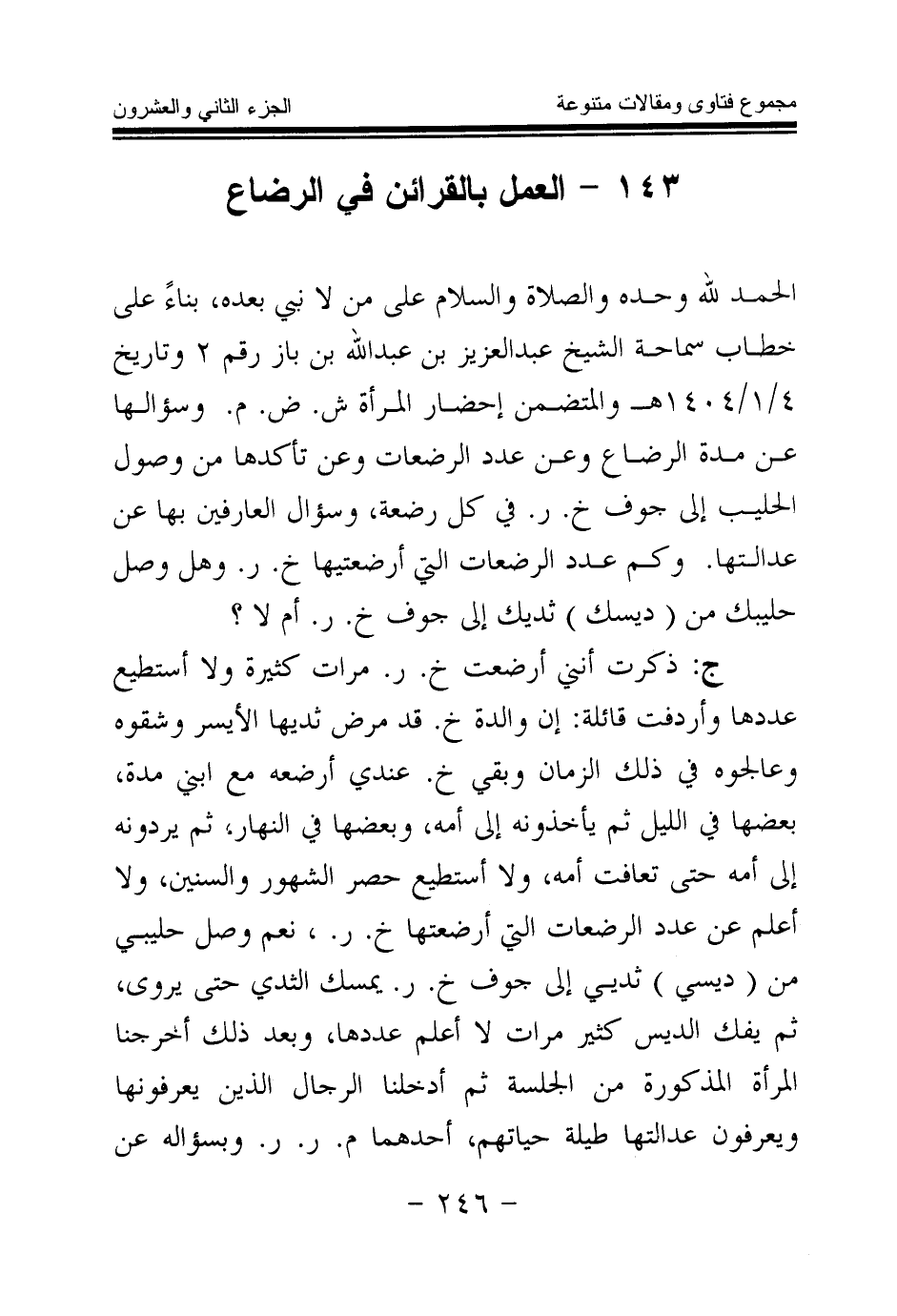 الحمد لله وحده والصلاة والسلام على من لا نبي بعده، بناء على خطاب سماحة الشيخ عبد العزيز بن عبد الله بن باز رقم 2 وتاريخ 4 \ 1 \ 1404هـ والمتضمن إحضار المرأة ش. ض. م. وسؤالها عن مدة الرضاع وعن عدد الرضعات وعن تأكدها من وصول الحليب إلى جوف خ. ر. في كل رضعة، وسؤال العارفين بها عن عدالتها. وكم عدد الرضعات التي أرضعتيها خ. ر. وهل وصل حليبك من (ديسك) ثديك إلي جوف خ. ر. أم لا؟