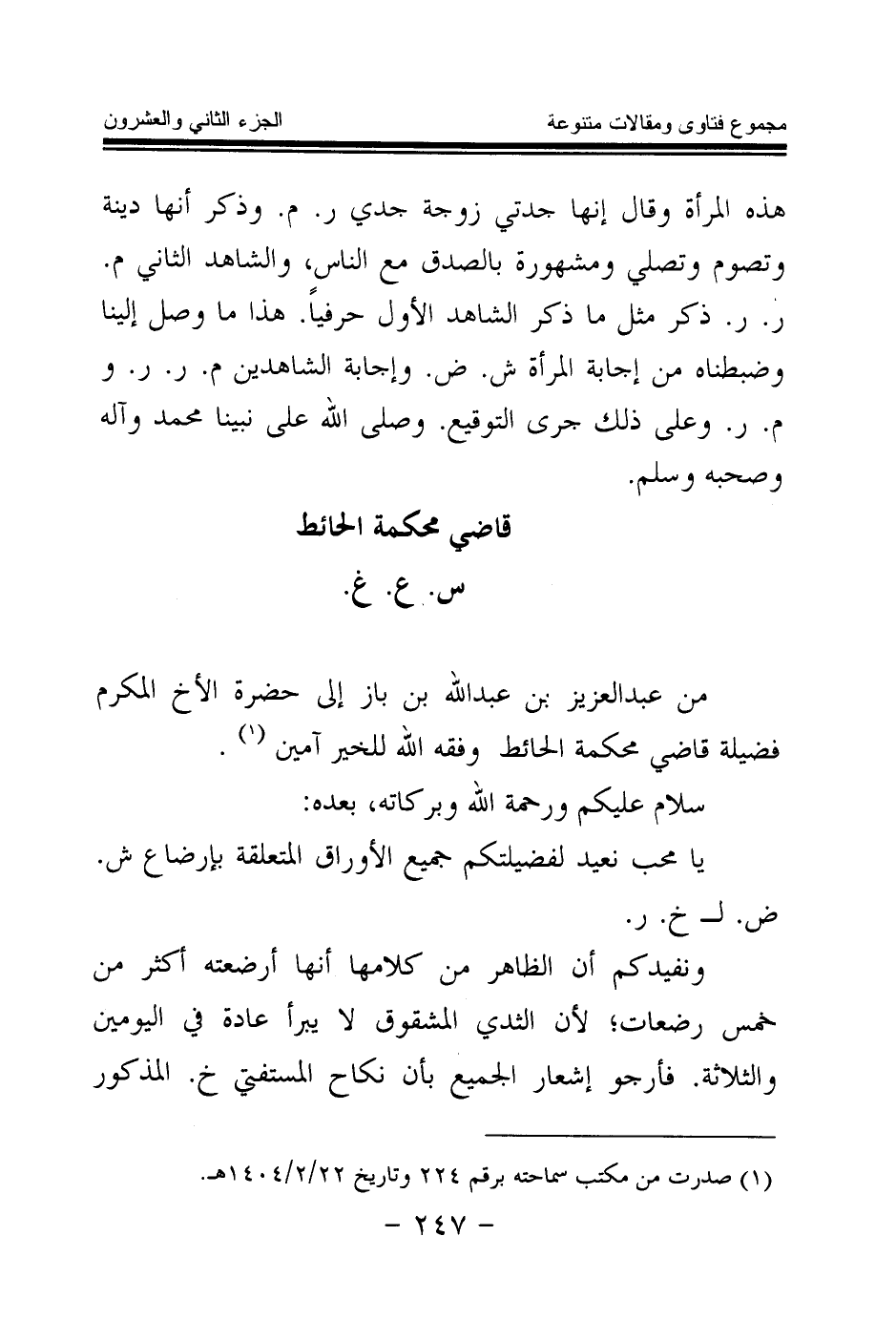من عبد العزيز بن عبد الله بن باز إلى حضرة الأخ المكرم فضيلة قاضي محكمة الحائط وفقه الله للخير آمين (¬1) .