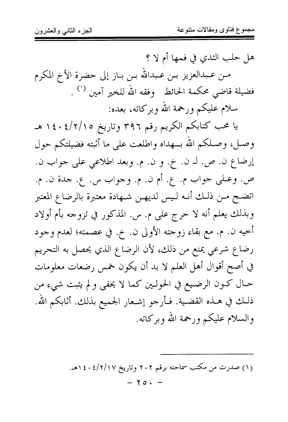(¬1) صدرت من مكتب سماحته برقم 202 وتاريخ 17 \ 2 \ 1404 هـ.