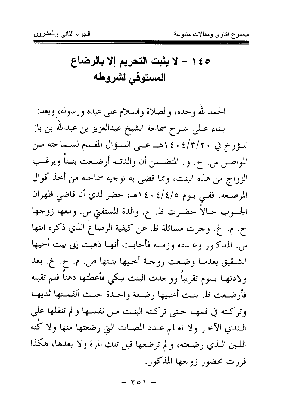 بناء على شرح سماحة الشيخ عبد العزيز بن عبد الله بن باز المؤرخ في 20 \ 3 \ 1404هـ على السؤال المقدم لسماحته من المواطن س. ح. و. المتضمن أن والدته أرضعت بنتا ويرغب الزواج من هذه البنت، ومما قضى به توجيه سماحته من أخذ أقوال المرضعة، ففي يوم 5 \ 4 \ 1404هـ، حضر لدي أنا قاض ظهران الجنوب حالا حضرت ظ. ح. والدة المستفتي س. ومعها زوجها ح. م. غ. وجرت مسائلة ظ. عن كيفية الرضاع الذي ذكره ابنها س. المذكور وعدده وزمنه فأجابت أنها ذهبت إلى بيت أخيها الشقيق بعدما وضعت زوجة أخيها بنتها ص. م. ح. خ. بعد ولادتها بيوم تقريبا ووجدت البنت تبكي فأعطتها دهنا فلم تقبله فأرضعت ظ. بنت أخيها رضعة واحدة حيث ألقمتها ثديها وتركته في فمها حتى تركته البنت من نفسها ولم تنقلها على الثدي الآخر ولا تعلم عدد المصات التي رضعتها منها ولا كنه اللبن الذي رضعته، ولم ترضعها قبل تلك المرة ولا بعدها، هكذا قررت بحضور زوجها المذكور.