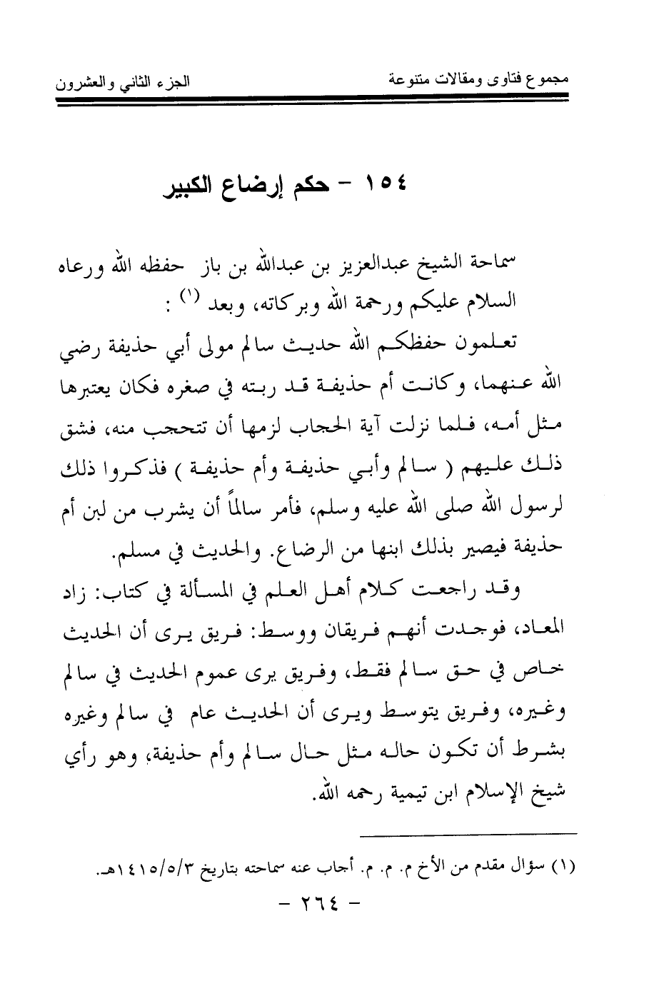 سماحة الشيخ عبد العزيز بن عبد الله بن باز حفظه الله ورعاه السلام عليكم ورحمة الله وبركاته، وبعد (¬1) : تعلمون حفظكم الله حديث سالم مولى أبي حذيفة - رضي الله عنهما -، وكانت أم حذيفة قد ربته في صغره فكان يعتبرها مثل أمه، فلما نزلت آية الحجاب لزمها أن تتحجب منه، فشق ذلك عليهم (سالم وأبي حذيفة وأم حذيفة) فذكروا ذلك لرسول الله - صلى الله عليه وسلم -، فأمر سالما أن يشرب من لبن أم حذيفة فيصير بذلك ابنها من الرضاع. والحديث في مسلم.