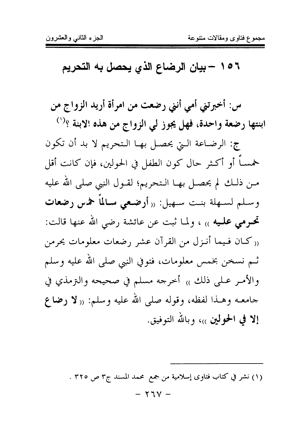 ج: الرضاعة التي يحصل بها التحريم لا بد أن تكون خمسا أو أكثر حال كون الطفل في الحولين، فإن كانت أقل من ذلك لم يحصل بها التحريم، لقول النبي - صلى الله عليه وسلم - لسهلة بنت سهيل: «أرضعي سالما خمس رضعات تحرمي عليه (¬2) » ، ولما ثبت عن عائشة - رضي الله عنها - قالت: «كان فيما أنزل من القرآن عشر رضعات معلومات يحرمن ثم نسخن بخمس معلومات، فتوفي النبي - صلى الله عليه وسلم - والأمر على ذلك (¬3) » أخرجه مسلم في صحيحه والترمذي في جامعه وهذا لفظه، وقوله - صلى الله عليه وسلم -: «لا رضاع إلا في الحولين (¬4) » ، وبالله التوفيق.