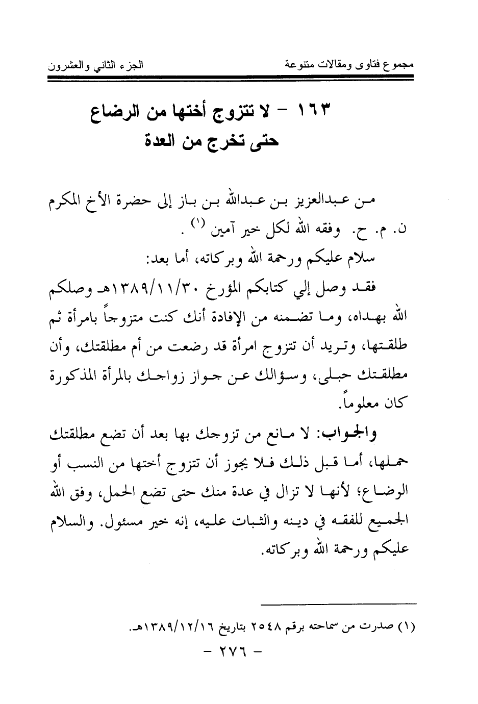 (¬1) صدرت من سماحته برقم 2548 بتاريخ 16 \ 12 \ 1389هـ.