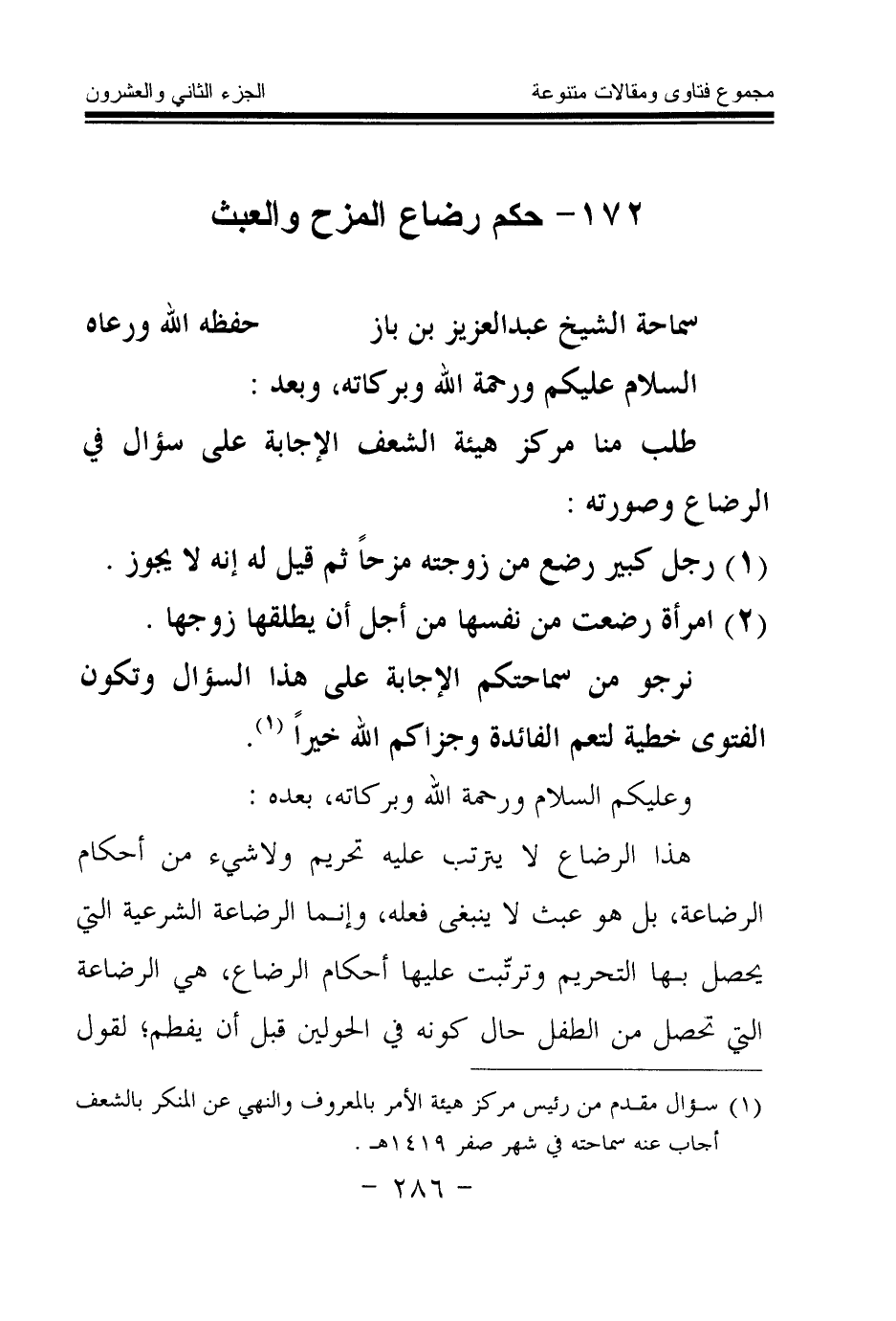 (1) رجل كبير رضع من زوجته مزحا ثم قيل له إنه لا يجوز.