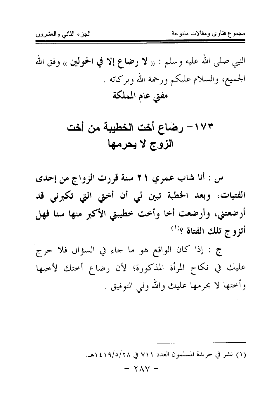 173 - رضاع أخت الخطيبة من أخت الزوج لا يحرمها