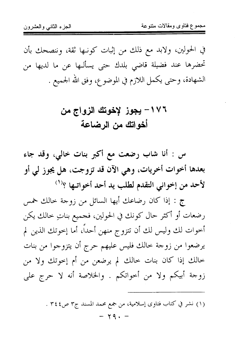 (¬1) نشر في كتاب فتاوى إسلامية، من جمع محمد المسند ج 3 ص 344.